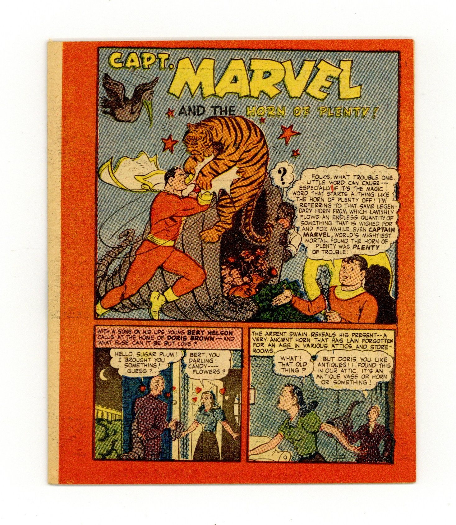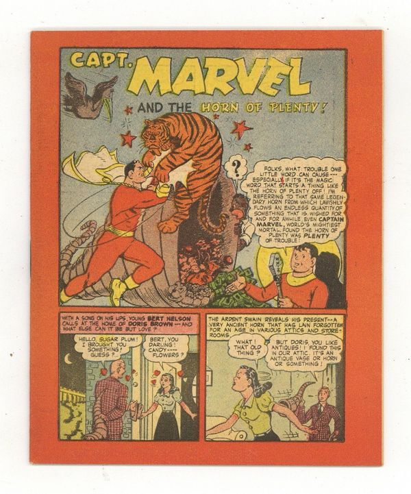 Captain Marvel "And the Horn of Plenty" (1946) is a promotional (mini) comic book published by Fawcett. Contains a story about Captain Marvel and a mysterious horn that grants wishes. This mini also contains a back-up story of Bulletman. 24 pages, black and white, 4-in. x 5-in., newsprint, no cover price.