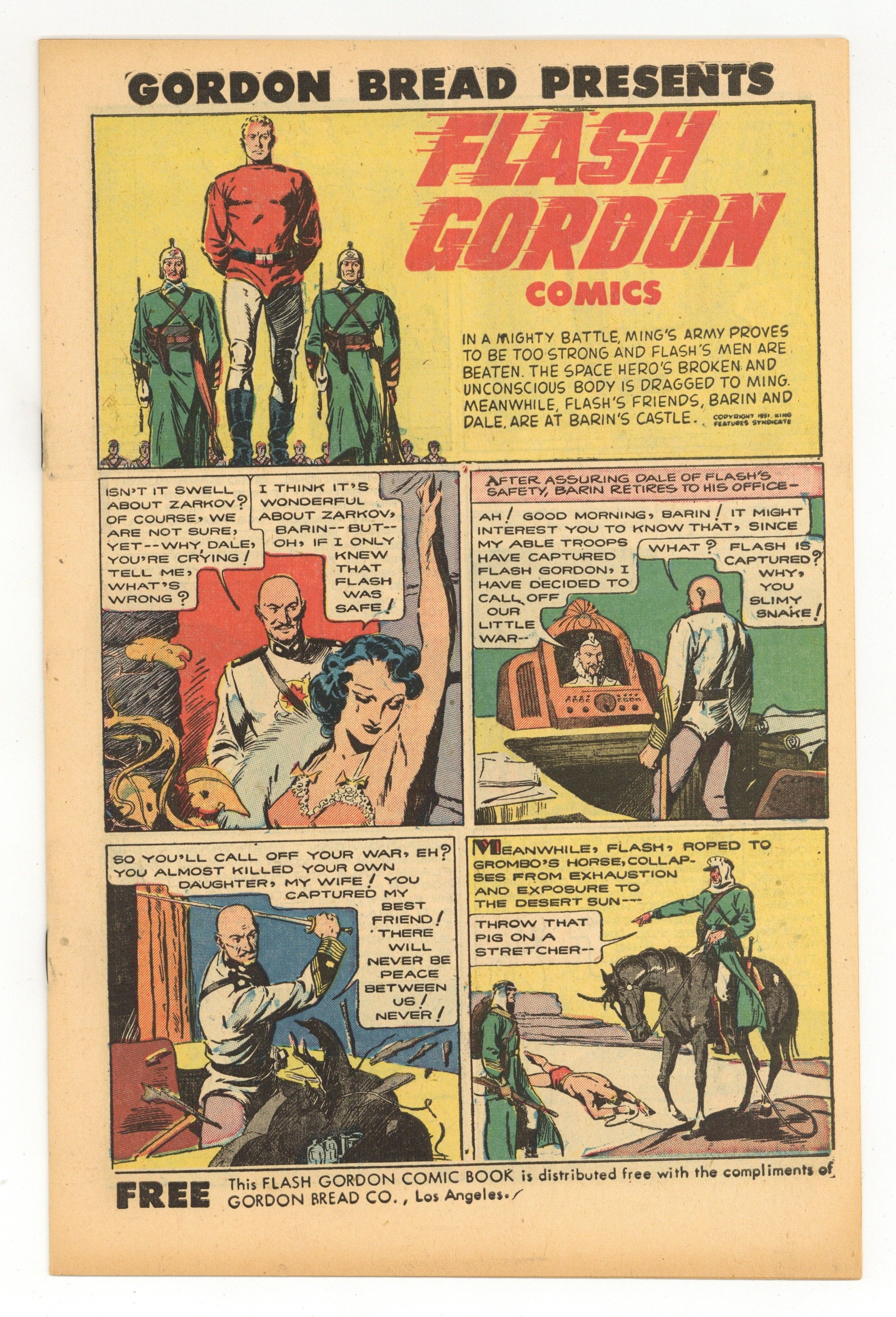 $15.00No. 1 is not numbered. Stories and art by Alex Raymond. Harvey reprints the original comic-strip adventures of legendary space-opera hero Flash Gordon and his struggle against interstellar tyrant Ming the Merciless. This issue features an injured Flash captured by Ming, and turned over to Doctor Bono, who secretly aids Flash in his recovery and escape. Produced by Harvey Publications as a promotional giveaway for Gordon Bread Co. 16 pages, Full color.