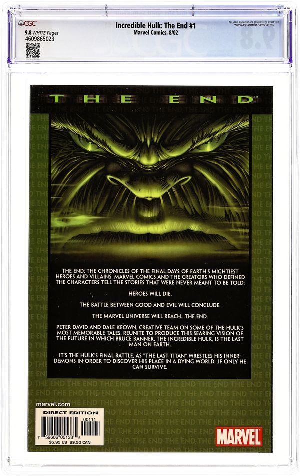 NOTE: Although a fairly recent comic, this issue was severely under-ordered by comic retailers, making the issue very difficult to find. COVER BY DALE KEOWN PETER DAVID (W)/DALE KEOWN (P)/JOE WEEMS (I) ? THE SCOOP: Writer Peter David and artist Dale Keown, the creative team on some of the most popular Hulk stories ever, reunite to tell the final adventure of the green goliath! ? THE SET-UP: Ever wonder how the careers of your favorite heroes would end? Us too, so we're asking the greatest creators associated with top characters to tell the final story as if their series were drawing to a close! ? THE STORY: You took a sneak peek at it in Wizard #126, now journey with us into a far-flung future in which the only things living on the planet Earth are Bruce Banner, the Incredible Hulk, and cockroaches with attitude... all of whom are at each other's throats! It's the final Hulk story ever as "The Last Titan" finally comes to understand his reason for existence -- if only he can survive it! ? THE WRITER SPEAKS: "It's about the relationship between the Hulk and Bruce Banner, and the final showdown between them," explained David. "By the end of the story, Banner will have a number of revelations about why things happened the way they did -- why the Hulk was created, why he has suffered through all this." ? THE FORMAT: This 48-page, bookshelf one-shot features a cardstock cover and is printed on glossy stock paper. 7-59606-05133-5-00111 (MarvelPG) 5.95 Cover price $5.95.