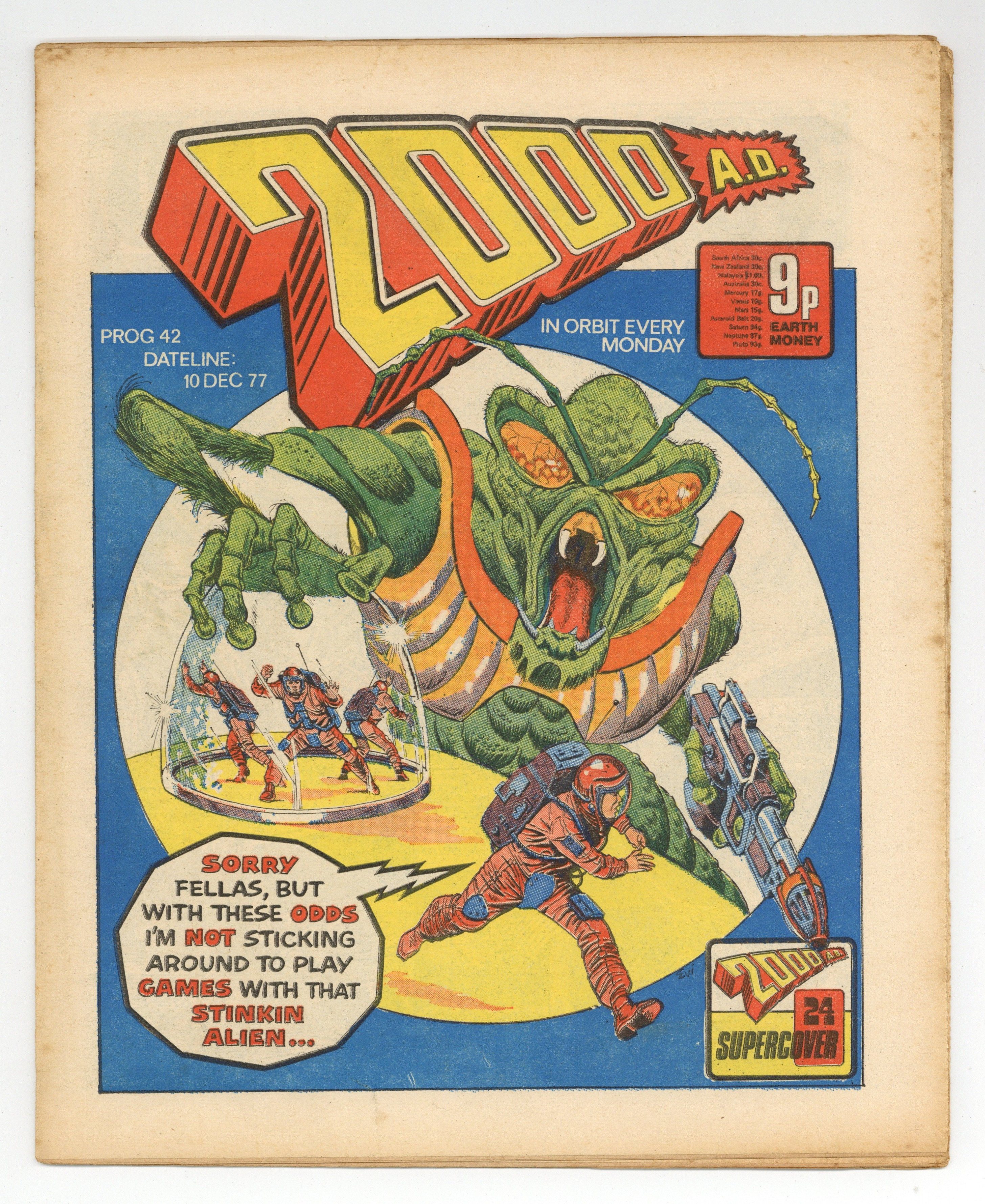Published Dec 1977 by IPC/Fleetway.$10.75December 10, 1977. Features include Judge Dredd (script by John Howard, art by Ian Gibson), Tharg's Future-Shocks (script by Martin Lock, art by Jose Ferrer), Invasion (script by Gerry Finley-Day, art by J. Clough), Dan Dare (script by Finley-Day, art by Dave Gibbons), M.A.C.H. 1 (script by Alan Hebden, art by Lozano/Canos), Inferno (script by Tom Tully, art by Belardinelli), and a Bonjo strip by Kevin O'Neill.