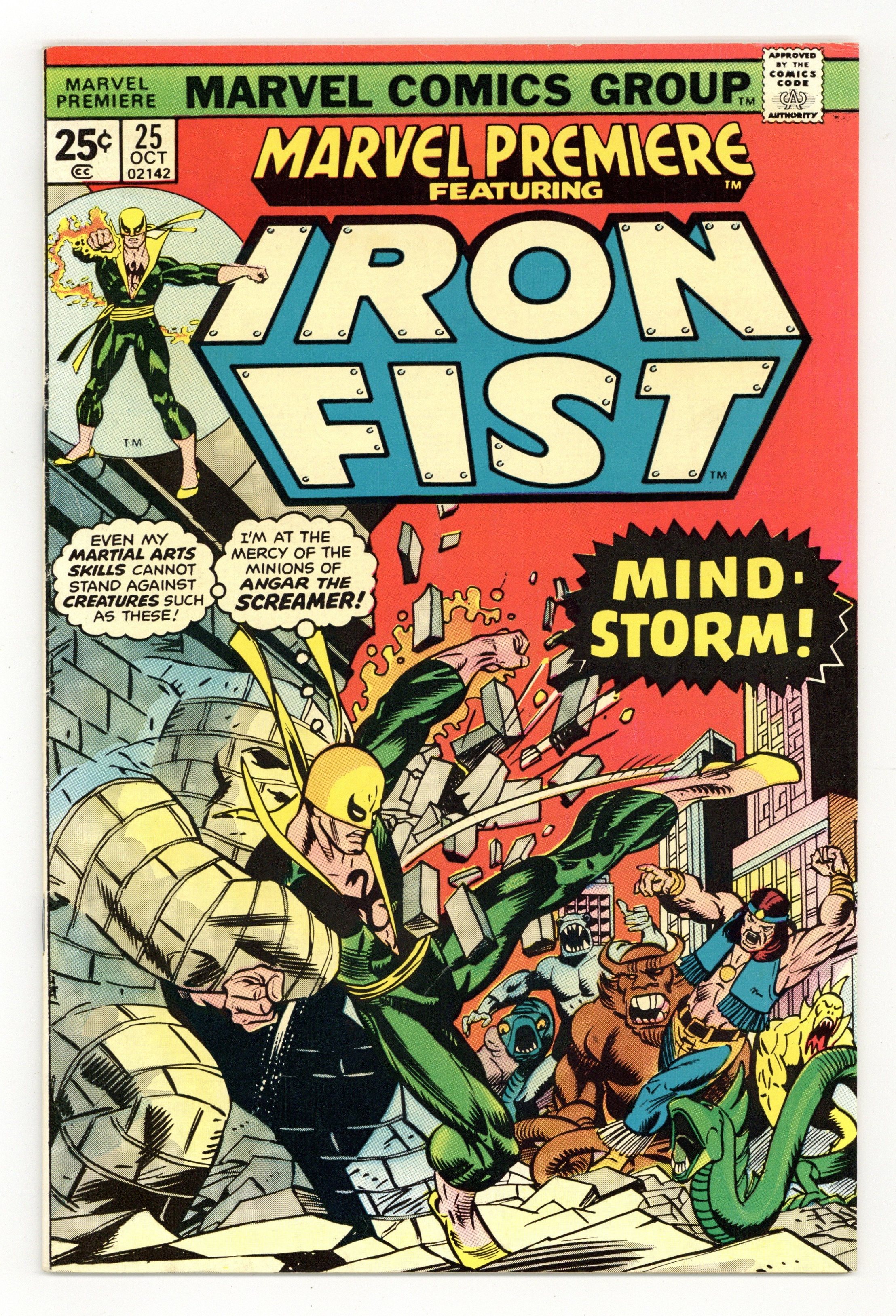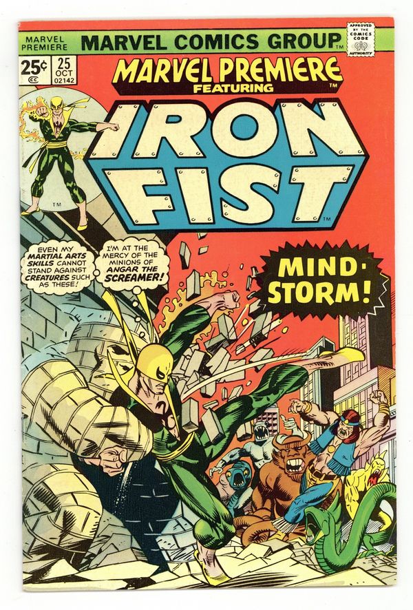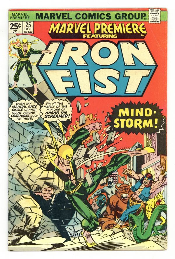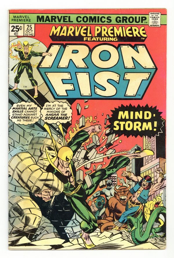 Tags: Martial Arts$21.50Cover pencils by Gil Kane, inks by Dan Adkins. Morning of the Mindstorm!, script by Chris Claremont, pencils by John Byrne, inks by Al McWilliams; Iron Fist arrives at the Wings to discover Colleen missing and Lee raving like a mad man; Danny and Scarfe try to track down Colleen but are assaulted by illusions courtesy of Angar; Beating Angar down, Iron Fist discovers a Stark International i.d. card on the villain and figures the company is behind the disappearance of his friend. Continued in Iron Fist (Marvel, 1975 series) #1. The letters page contains Marvel Value Stamp series A # 6 (Thor by John Buscema). 36 pgs. $0.25. Cover price $0.25.