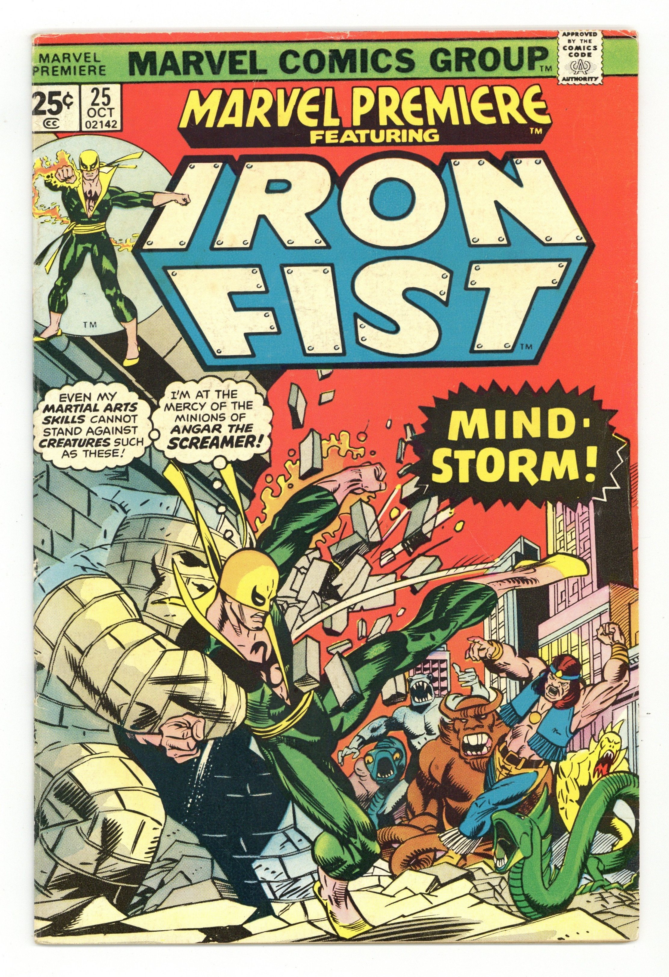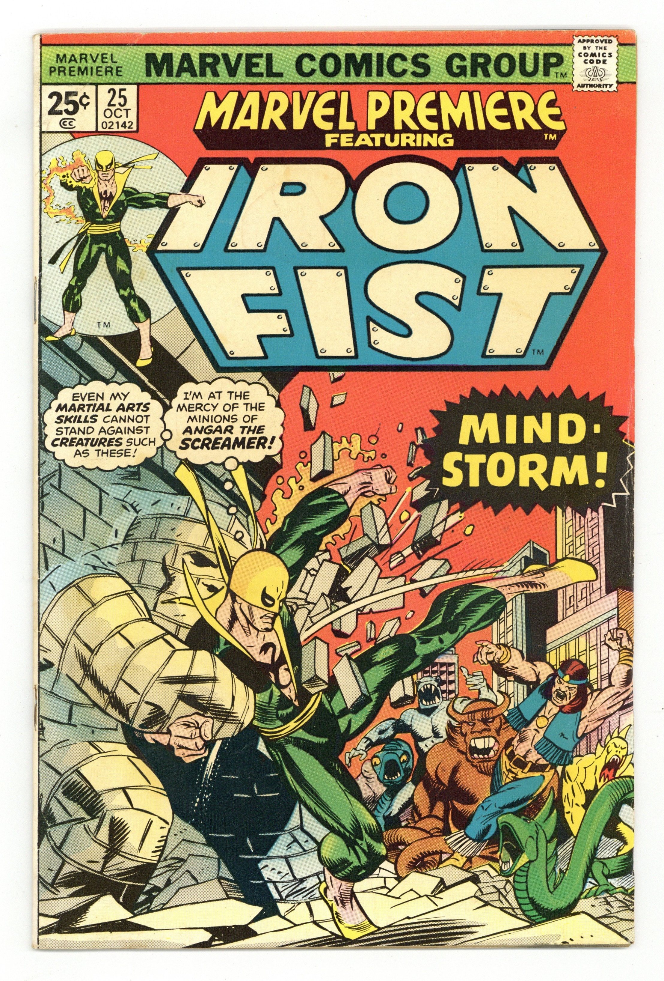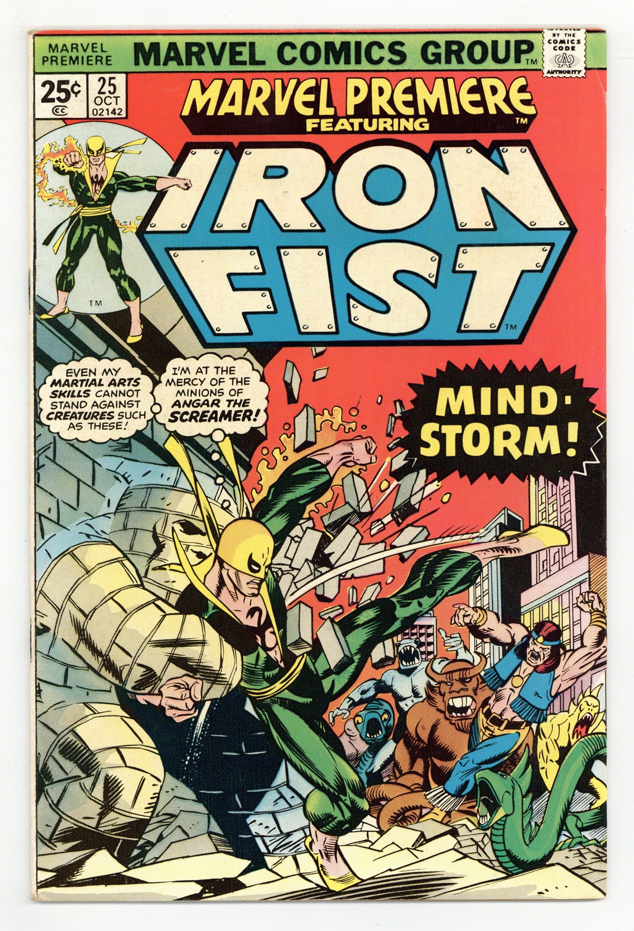 Tags: Martial Arts$21.50Cover pencils by Gil Kane, inks by Dan Adkins. Morning of the Mindstorm!, script by Chris Claremont, pencils by John Byrne, inks by Al McWilliams; Iron Fist arrives at the Wings to discover Colleen missing and Lee raving like a mad man; Danny and Scarfe try to track down Colleen but are assaulted by illusions courtesy of Angar; Beating Angar down, Iron Fist discovers a Stark International i.d. card on the villain and figures the company is behind the disappearance of his friend. Continued in Iron Fist (Marvel, 1975 series) #1. The letters page contains Marvel Value Stamp series A # 6 (Thor by John Buscema). 36 pgs. $0.25. Cover price $0.25.
