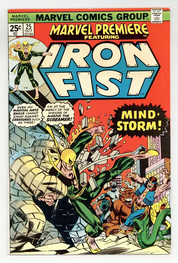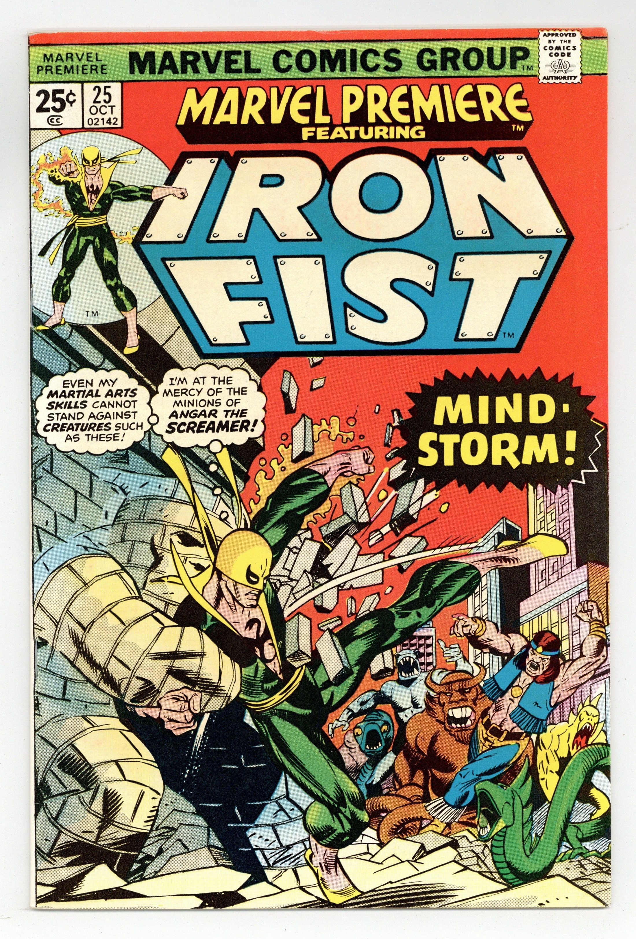 Tags: Martial Arts$19.50Cover pencils by Gil Kane, inks by Dan Adkins. Morning of the Mindstorm!, script by Chris Claremont, pencils by John Byrne, inks by Al McWilliams; Iron Fist arrives at the Wings to discover Colleen missing and Lee raving like a mad man; Danny and Scarfe try to track down Colleen but are assaulted by illusions courtesy of Angar; Beating Angar down, Iron Fist discovers a Stark International i.d. card on the villain and figures the company is behind the disappearance of his friend. Continued in Iron Fist (Marvel, 1975 series) #1. The letters page contains Marvel Value Stamp series A # 6 (Thor by John Buscema). 36 pgs. $0.25. Cover price $0.25.
