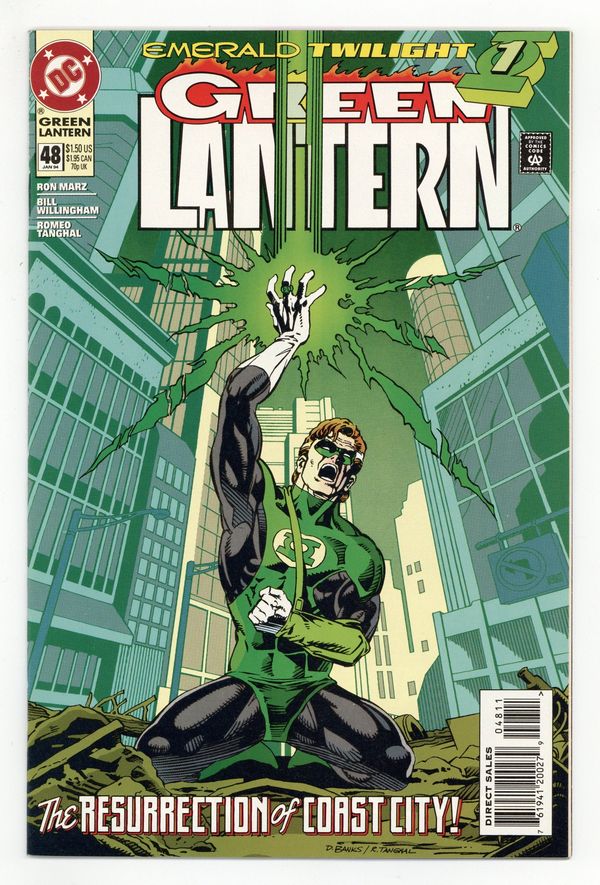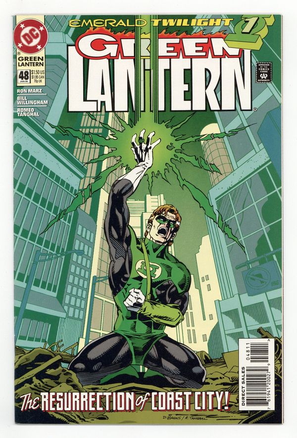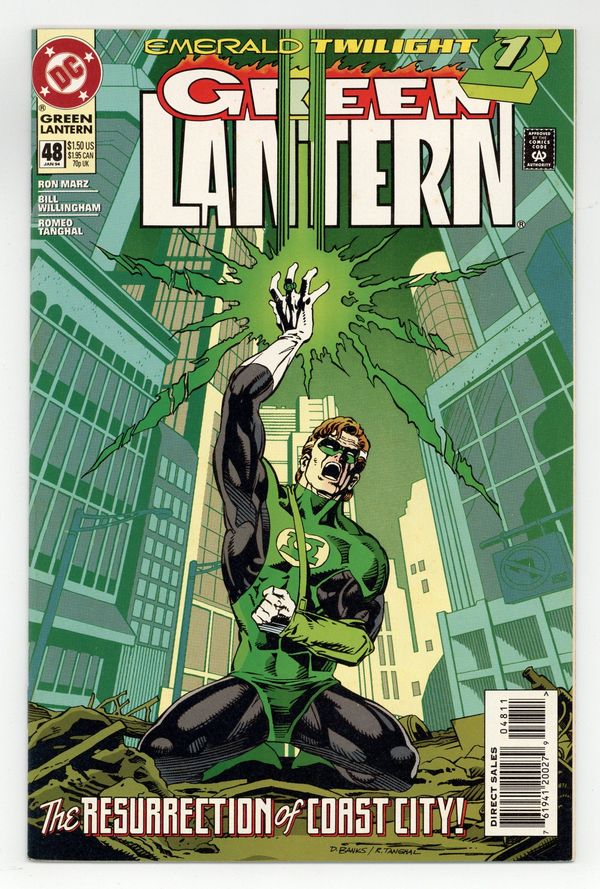 Direct Edition. Emerald Twilight: Part 1 of 3. "The Past!" Story by Ron Marz. Art by Bill Willingham, Robert Campanella, and Romeo Tanghal. It's the beginning of the end for Hal Jordan. In this seminal chapter in the life of Green Lantern, Hal returns to ground zero and attempts to use his Power Ring to resurrect the devastated Coast City. But what happens if he doesn't have enough power? Don't miss the most unexpected turn in the life of Hal Jordan as DC counts down to a very special 50th issue. NOTE: 1st appearance of Kyle Rayner. Cover price $1.50.
