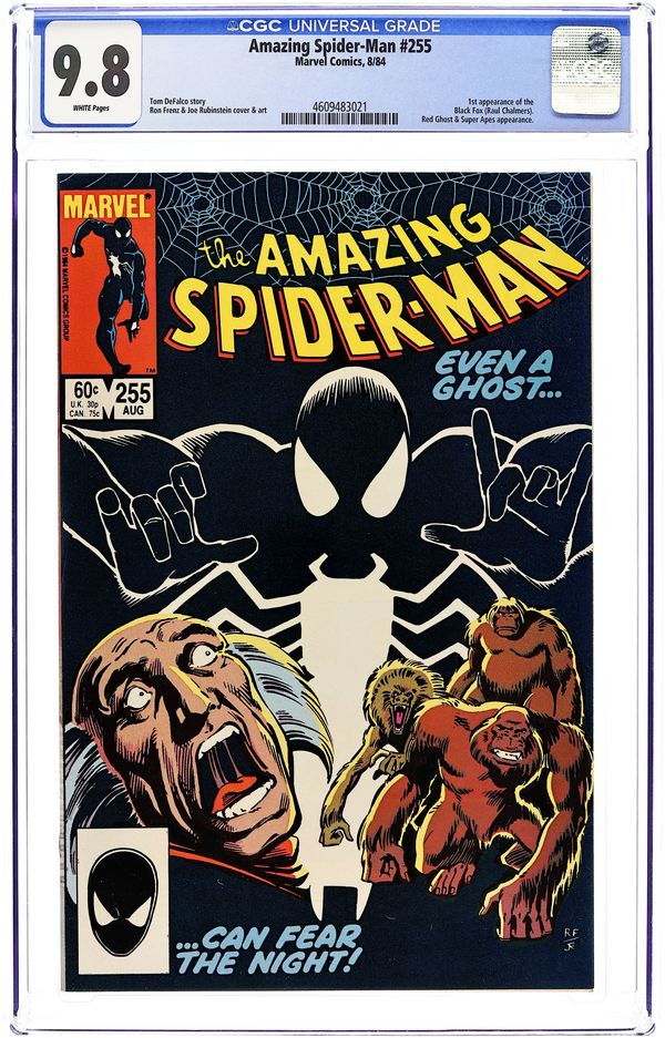 Direct Edition. "Even a Ghost Can Fear the Night!" Script by Tom DeFalco. Pencils by Ron Frenz. Inks by Joe Rubinstein. Cover by Ron Frenz and Joe Rubinstein. The international jewel thief extraordinaire known as the Black Fox breaks into an upscale Manhattan apartment! But regrettably for the aging burglar, the residents of the apartment are none other than the Red Ghost and his Super Apes! After capturing the would-be thief, the Soviet super-villain decides to put the fox to work for himself! When the Black Fox (with the Super Apes in tow) burglarizes a local jewelry store, he encounters another problem...the Amazing Spider-Man! Can Spidey juggle one fox, one ghost, and a trio of apes? Meanwhile, the web-slinger's new black (symbiote) costume begins acting strangely while its wall-crawling host is asleep! First appearance of the Black Fox. Cameo appearance by the Hobgoblin. Flashback cameos by the Fantastic Four, Iron Man, and Jack O'Lantern. (Notes: The Red Ghost returns in Quasar 6. The Black Fox appears again in Amazing Spider-Man 265.) 36 pages. Cover price $0.60.