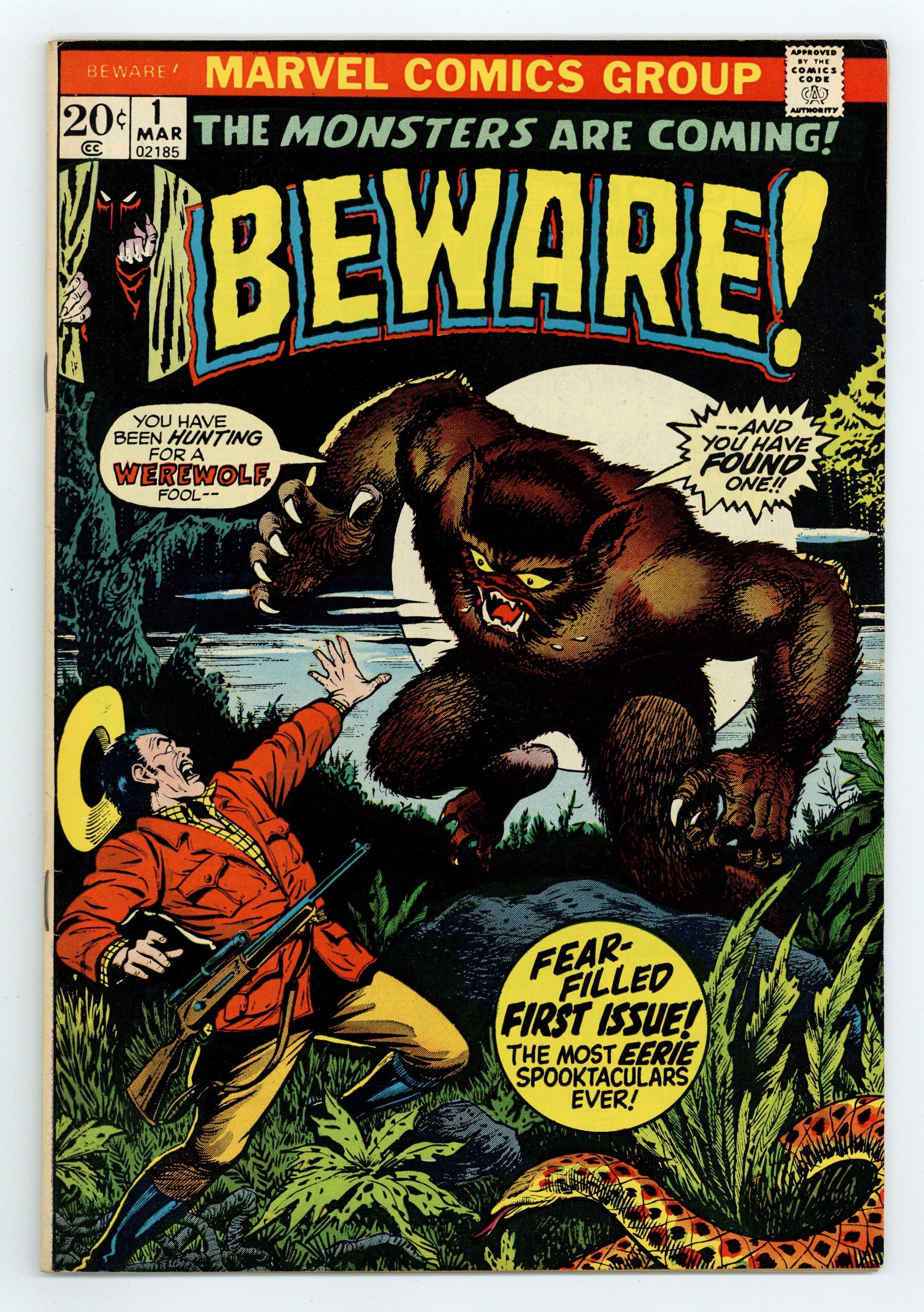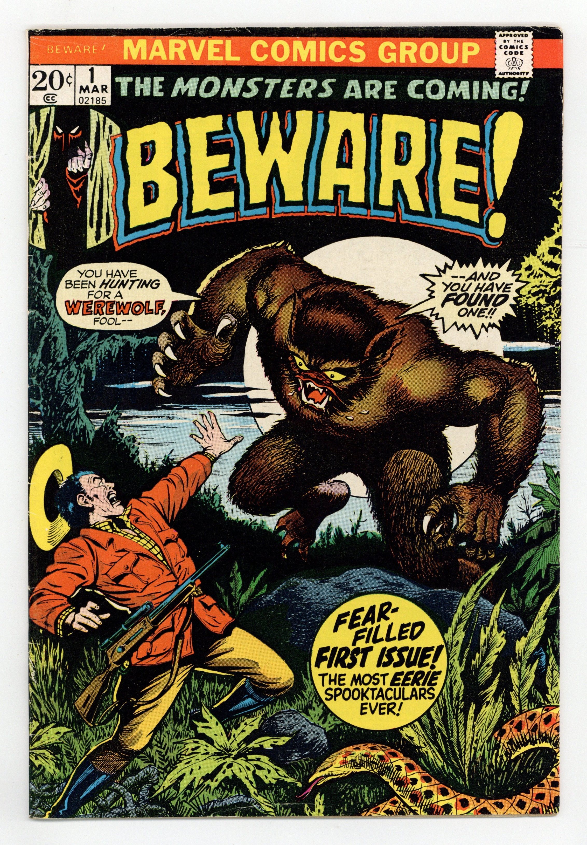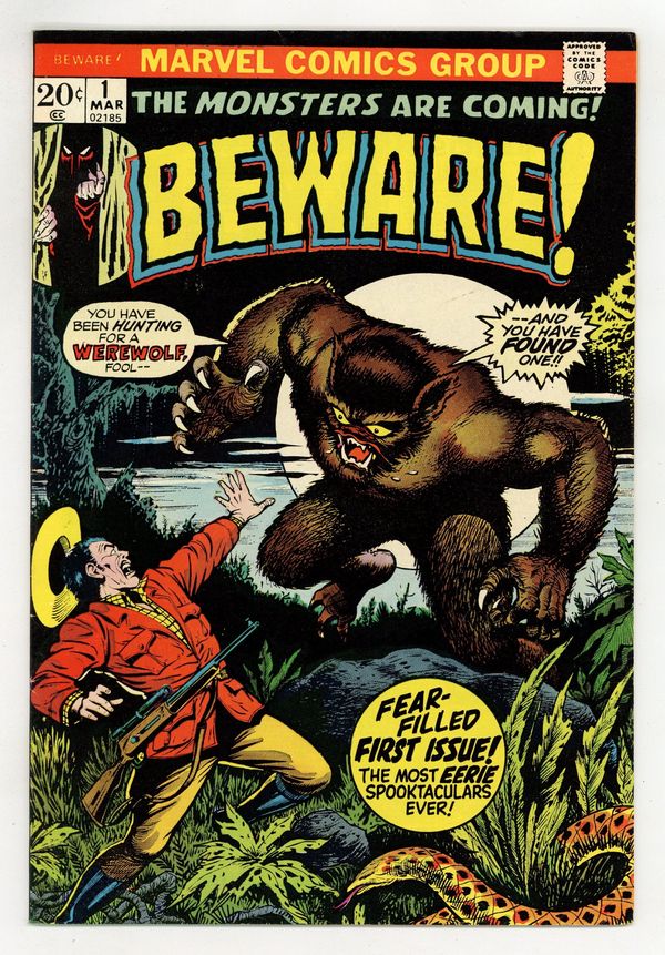 "The Werewolf Was Afraid!"; "Too Human to Live!" with art by Carabotta/Abel; "On the Trail of the Witch!" with pencils by Jack Kirby; and "Behind the Door" with art by Joe Sinnott. Cover by Bill Everett. Stories by John Romita, Vic Carabotta, Jack Abel, Stan Lee, Larry Lieber, Jack Kirby, Dick Ayers, and Joe Sinnott. Beware of these fear-filled suspense stories fill with action, intrigue and, best of all, monsters! All reprints from Menace, Spellbound, and Tales of Suspense. 36 pages, full color. $0.20. Cover price $0.20.
