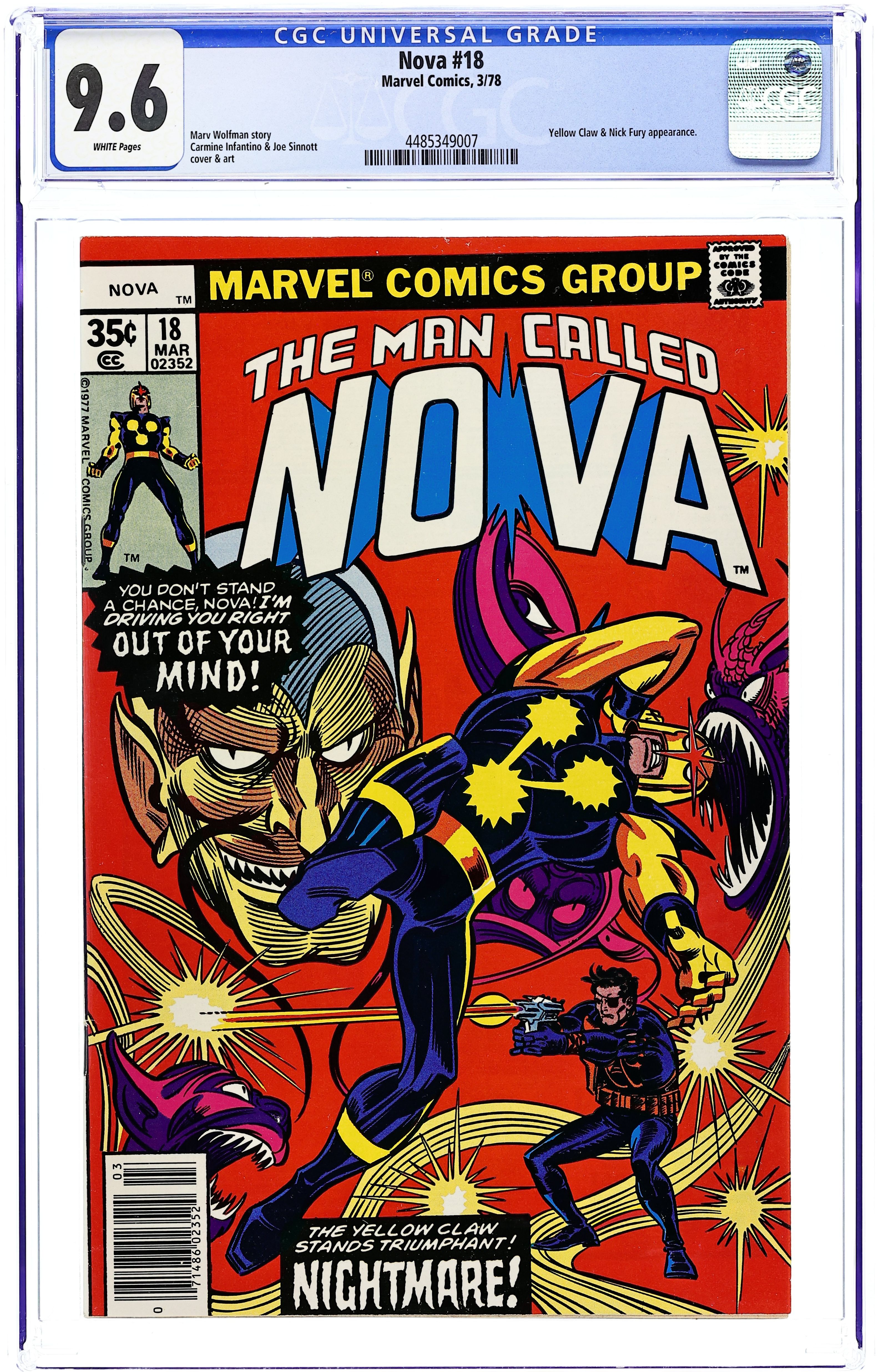 "The Final Showdown!" Guest-starring Nick Fury. This is it, the conclusion to Nova's epic struggle against the sinister Yellow Claw. As Nick Fury and S.H.I.E.L.D. try desperately to halt the advance of the super tsunami, Nova stands alone in single combat with the mastermind behind it all. Plus, the back-up story "Beginnings!" Story by Marv Wolfman. Art by Carmine Infantino and The Tribe. 32 pages. Cover price $0.35.