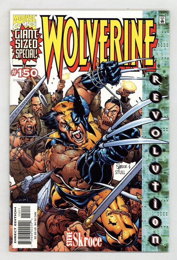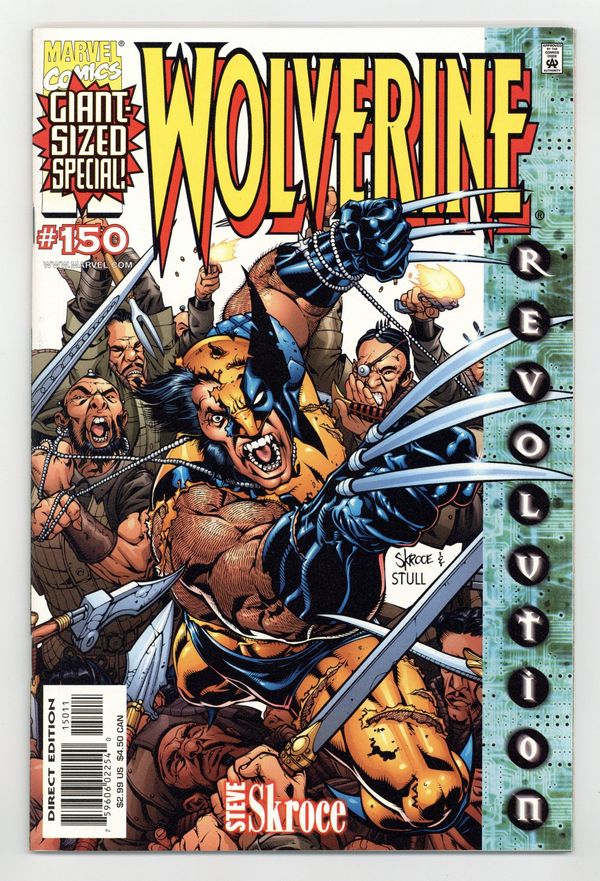 $16.00White cover; green sidebar to the right thet reads "Revolution" THE SCOOP: A bold new era for the X-Men begins! THE STORY: "Blood Debt." The next chapter in Wolverine's life starts in this double-sized extravaganza! While old friends return to Wolverine's life, some brand-new?and decidedly vicious?enemies make their move! It's been six months since the war with Apocalypse, the return of his adamantium, the taking of his free will and the heartrending sacrifice. Now, as Logan grapples with the emotional repercussions, a new evil arises that targets his very heart! Who is Lord Haan, and how might his vile bloodline consume Wolverine? Plus: What are Silver Samurai and Yukio doing back in Logan's life? THE CREATORS: Starting with this double-sized issue, Steve Skroce takes over as both writer and penciler. Steve is best known for his kinetic art on AMAZING SPIDER- MAN and GAMBIT and for his work as storyboard artist for the hit movie, The Matrix. Skroce's thoughts on Wolverine: "He's a man with a shady past that's still torn between his animal and his human sides. I want to explore that without walking too much on worn territory. I want to focus less on the one-liners and more on the quiet beats between events." Inks by Lary Stucker. Skroce cover. THE FORMAT: 48 pages, with ads. Cover price $2.99.