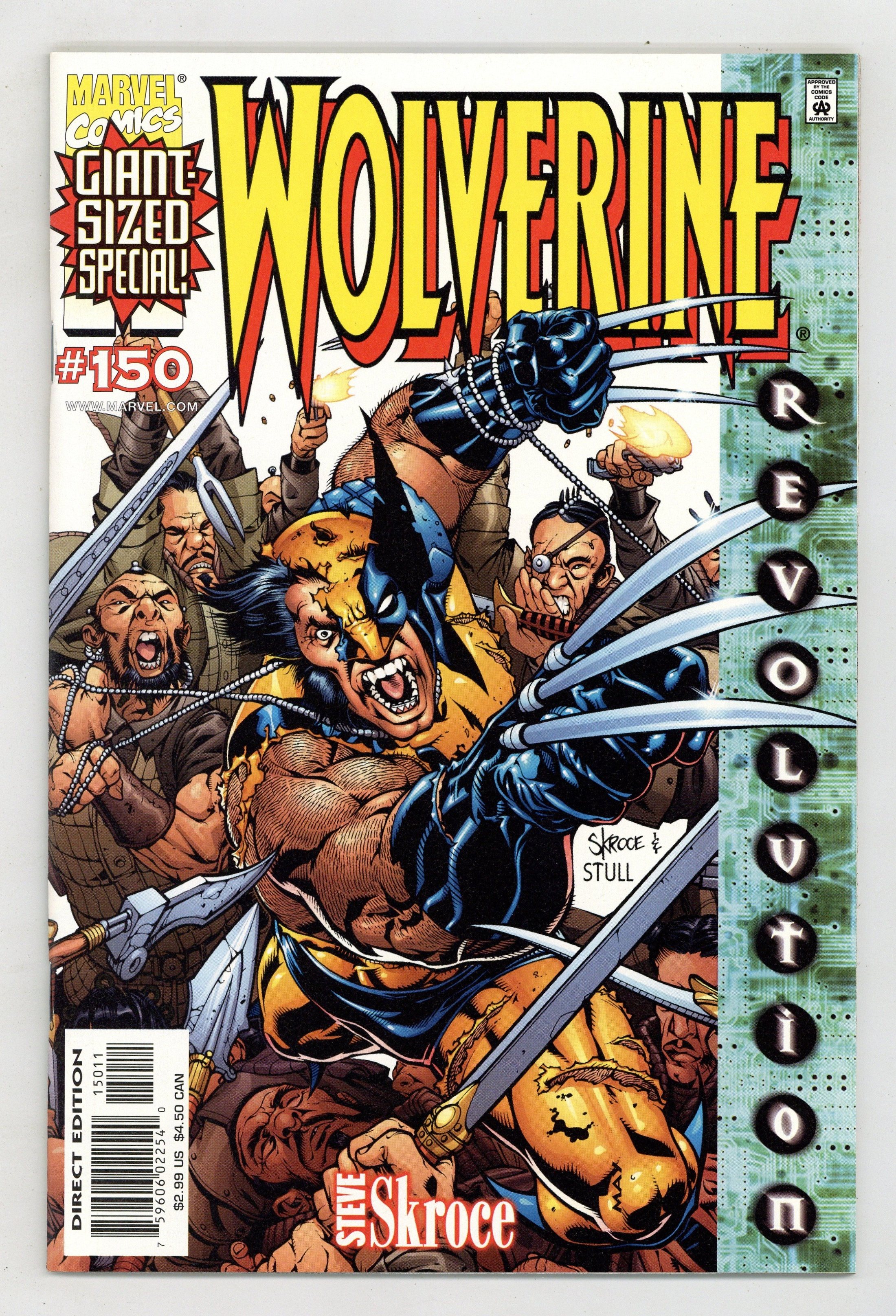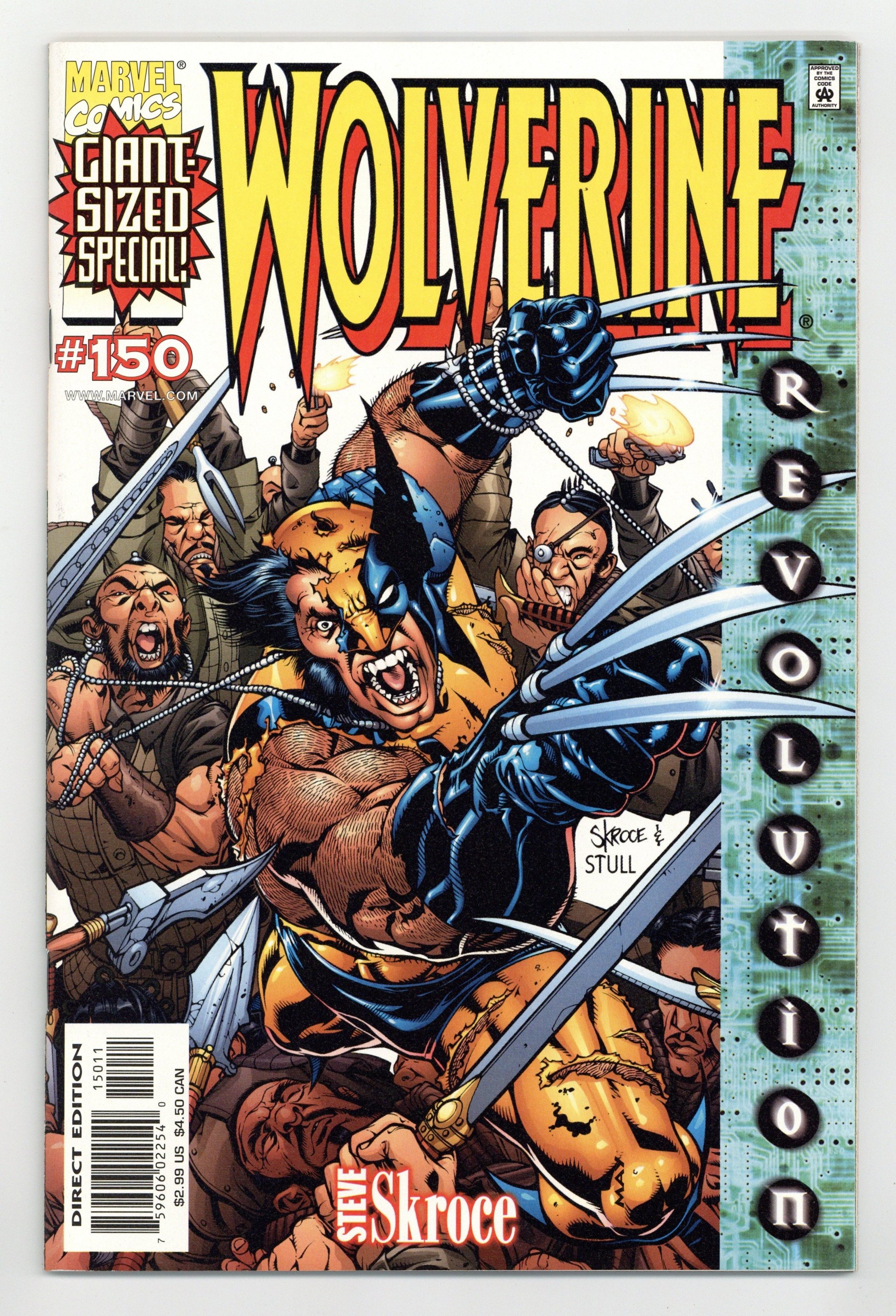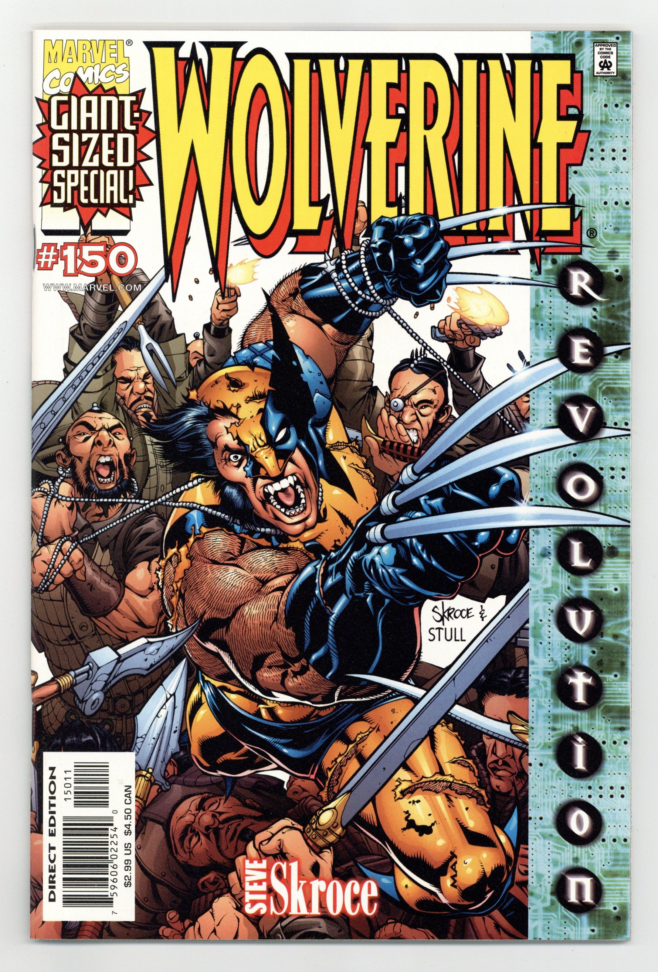 $15.00White cover; green sidebar to the right thet reads "Revolution" THE SCOOP: A bold new era for the X-Men begins! THE STORY: "Blood Debt." The next chapter in Wolverine's life starts in this double-sized extravaganza! While old friends return to Wolverine's life, some brand-new?and decidedly vicious?enemies make their move! It's been six months since the war with Apocalypse, the return of his adamantium, the taking of his free will and the heartrending sacrifice. Now, as Logan grapples with the emotional repercussions, a new evil arises that targets his very heart! Who is Lord Haan, and how might his vile bloodline consume Wolverine? Plus: What are Silver Samurai and Yukio doing back in Logan's life? THE CREATORS: Starting with this double-sized issue, Steve Skroce takes over as both writer and penciler. Steve is best known for his kinetic art on AMAZING SPIDER- MAN and GAMBIT and for his work as storyboard artist for the hit movie, The Matrix. Skroce's thoughts on Wolverine: "He's a man with a shady past that's still torn between his animal and his human sides. I want to explore that without walking too much on worn territory. I want to focus less on the one-liners and more on the quiet beats between events." Inks by Lary Stucker. Skroce cover. THE FORMAT: 48 pages, with ads. Cover price $2.99.