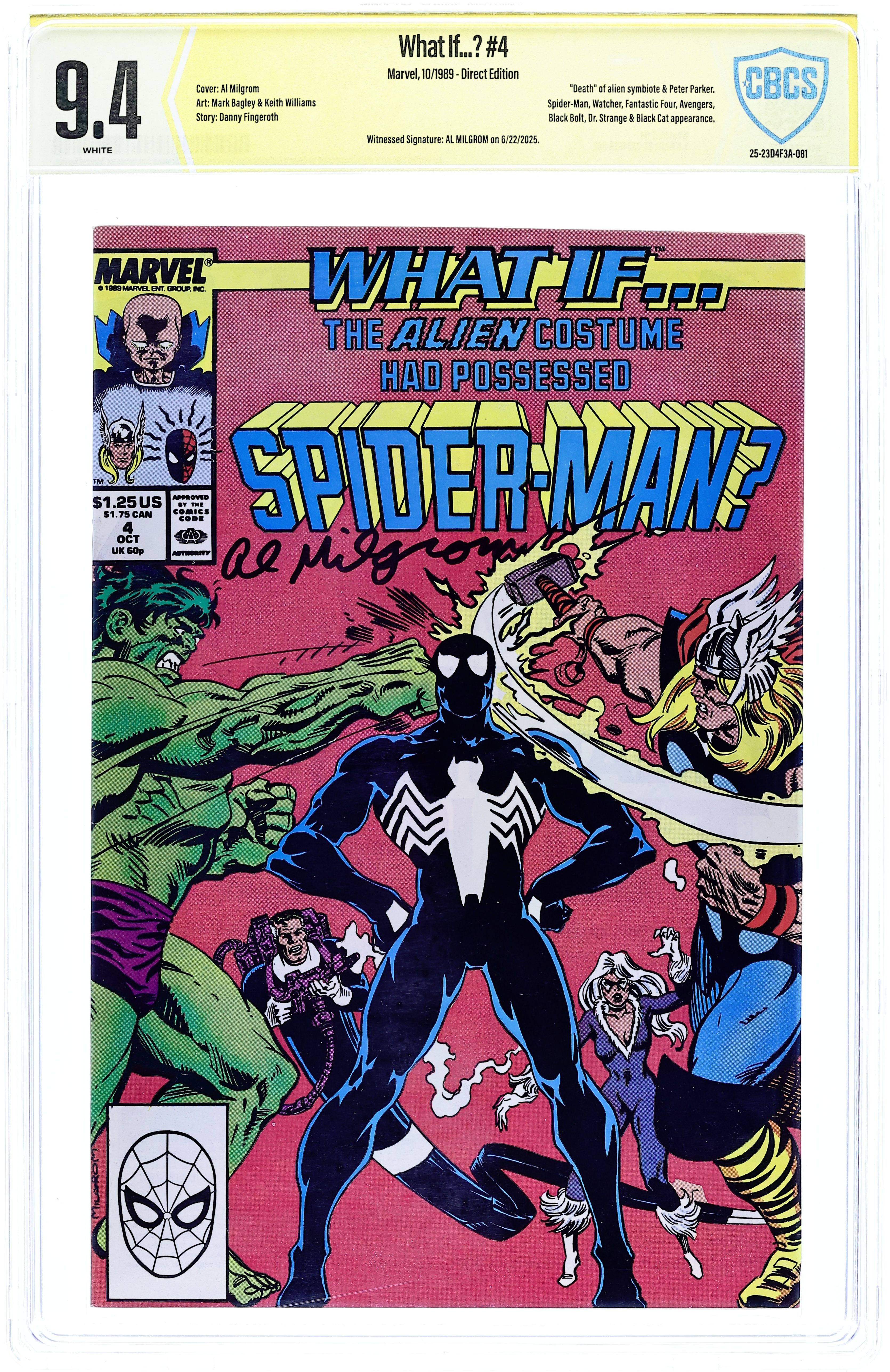 First Printing. Direct Edition. Cover art by Al Milgrom. What if the Alien Costume had Possessed Spider-Man, script by Danny Fingeroth, pencils by Mark Bagley, inks by Keith Williams; The Costume fully possesses Spider-Man, and goes on to possess Hulk and Thor. Guest starring Reed Richards (of the Fantastic Four), the Black Cat, Doctor Strange, the Avengers, and Black Bolt (of the Inhumans). Kingpin cameo. 36 pgs. $1.25. NOTE: 1993 JC Penney reprint exists. It can be identified by having the words "The Amazing Spider-Man" printed in the UPC box. Cover price $1.25.