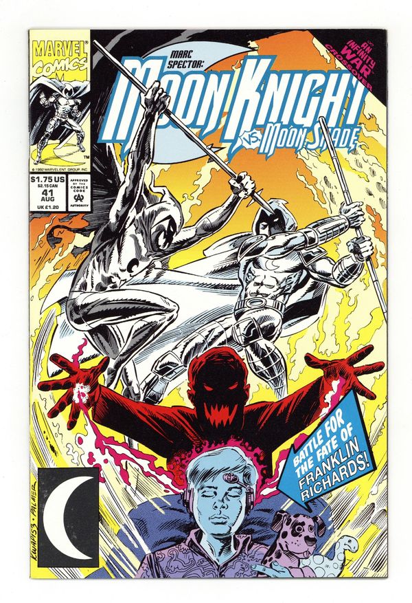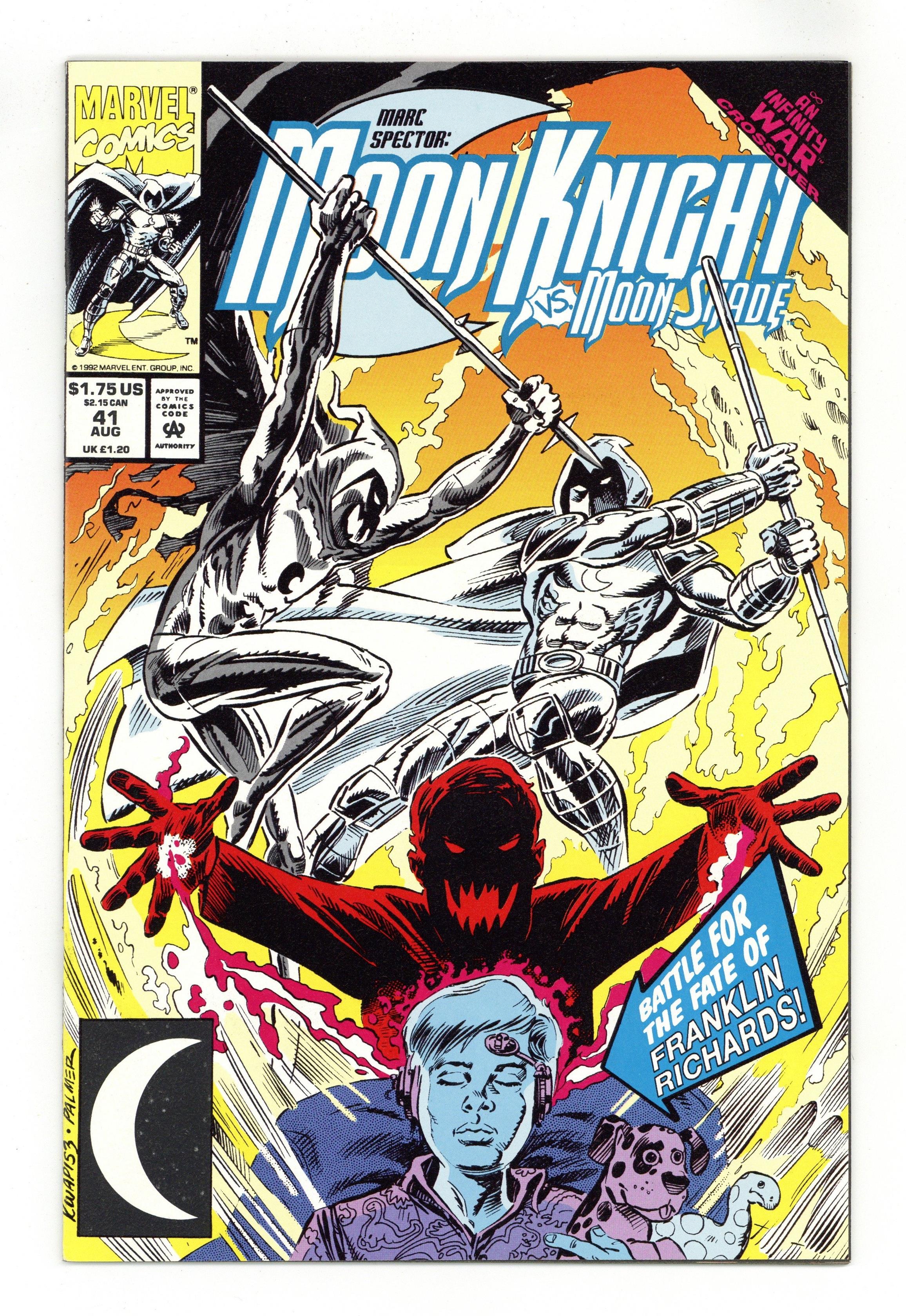 Cover pencils by Gary Kwapisz, inks by Tom Palmer. The Dark Doppelgangers Descend, script by Terry Kavanagh, pencils by Gary Kwapisz, inks by Tom Palmer; Moon Knight engages in the superhero free for all that occurs in Four Freedoms Plaza when Daredevil declares that Mr. Fantastic is a dupe and attacks him; After the dust settles (and a Gamma Bomb is diffused), MK and his fellow heroes who have stayed on earth are attacked by doppelgangers sent by the Magus; Moon Knight saves Franklin Richards from the evil version of himself but finds himself facing his own personal demon; The MK doppelganger begins absorbing Moon Knights from other dimensions and becomes the creature known as Moon Shade. Infinity War crossover. 36 pgs. $1.75. Cover price $1.75.