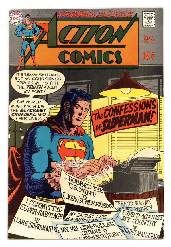 Cover pencils by Curt Swan, inks by Murphy Anderson. "The Confessions of Superman," script by Leo Dorfman, pencils by Curt Swan, inks by George Roussos; The Superman Revenge Squad sends two agents to defeat Superman, which they do by framing him for crimes against the United States; Due to the influence of Red Kryptonite, Superman is convinced that he is responsible for the crimes. Superman's Girl Friend, Lois Lane ad. Supergirl ad. Tales of the Legion of Super-Heroes back-up, "Half a Legionnaire?", script by Jim Shooter, pencils by Win Mortimer, inks by Jack Abel; When Duo Damsel sends just one of her selves on an extended mission, it seems to return with its own personality, but it is really just the result of proximity to the power of the hero she met on the mission; Appearances by the Duo Damsel, Bouncing Boy, Mon-El, and Nam'Lor. 36 Pages, Full Color. $0.15 Cover price $0.15.