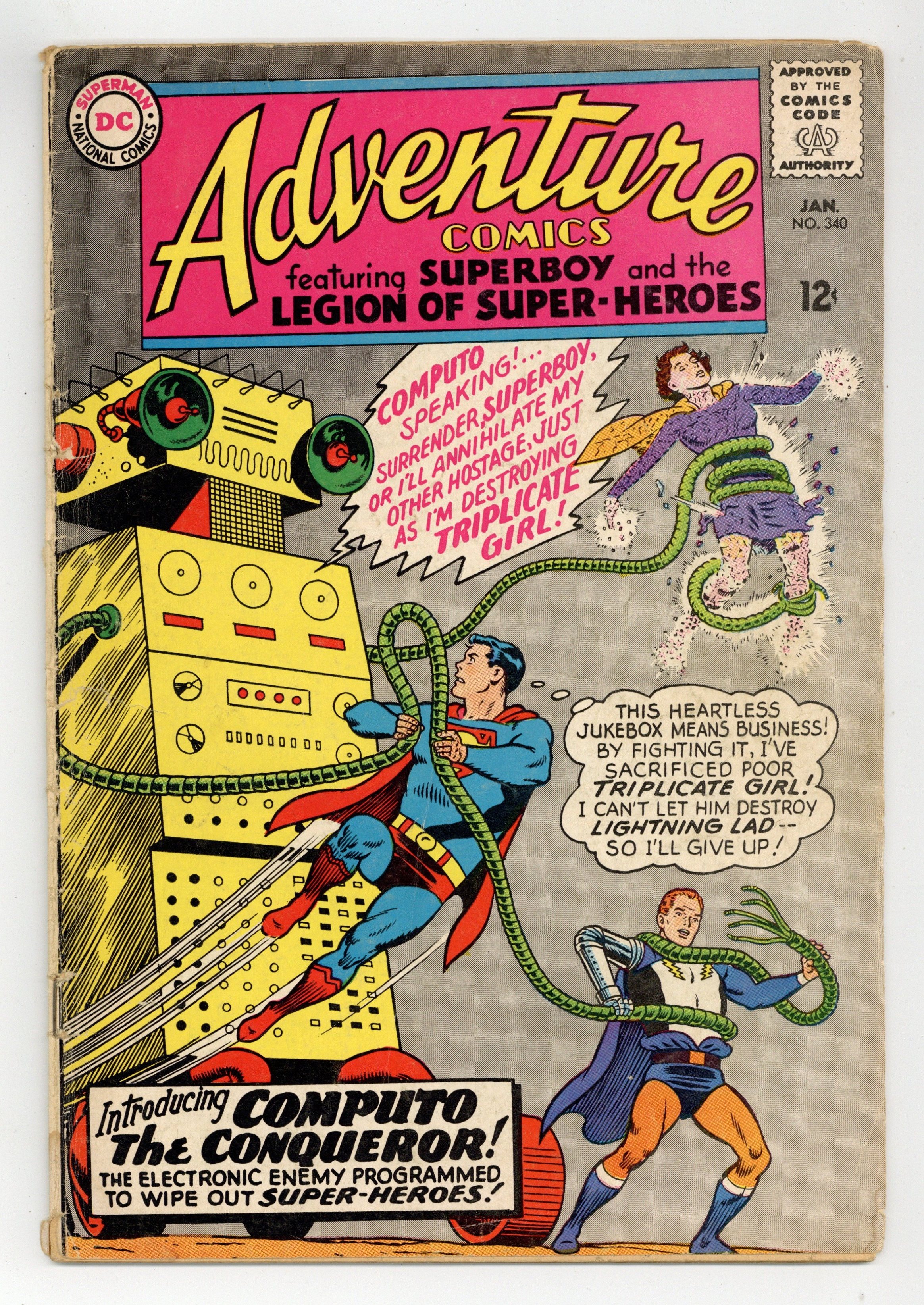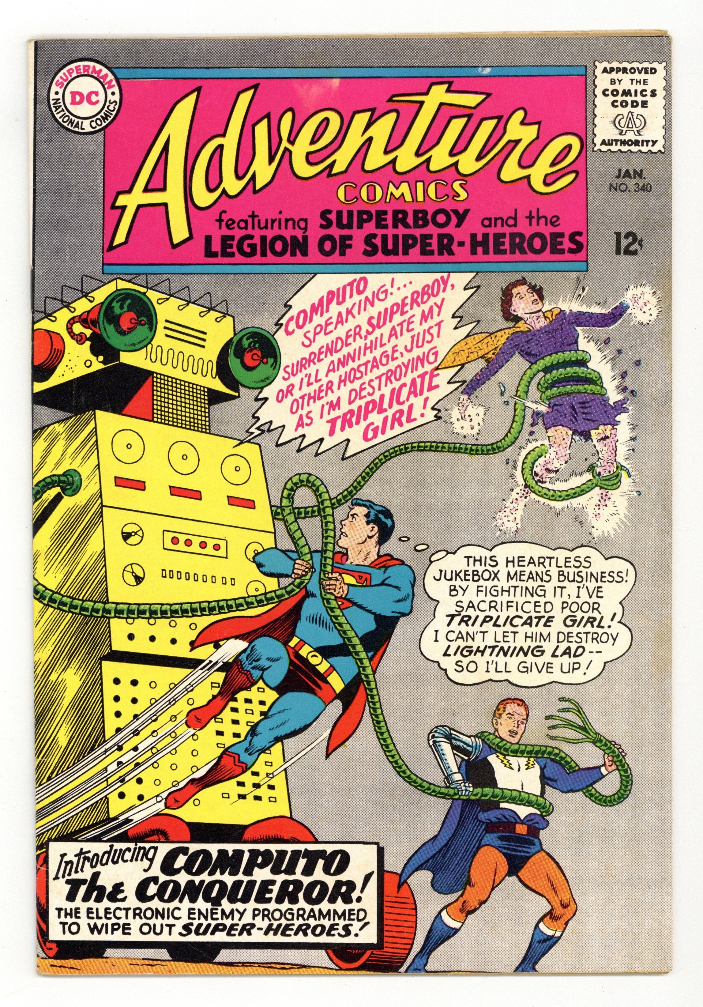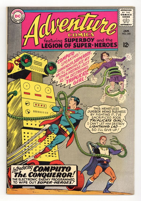 Cover pencils by Curt Swan, inks by George Klein. Intro of Computo in Computo the Conqueror!--Tales of the Legion of Super-Heroes, script by Jerry Siegel, pencils by Curt Swan, inks by George Klein; Brainiac 5's latest creation turns on its master and the rest of the Legion. Mystery of the Space Trophies starring Superboy, script by Otto Binder, pencils by John Sikela, inks by John Sikela. Rocky and Bullwinkle star in a one-page Cheerios ad. 36 Pages, Full Color. Cover price $0.12.