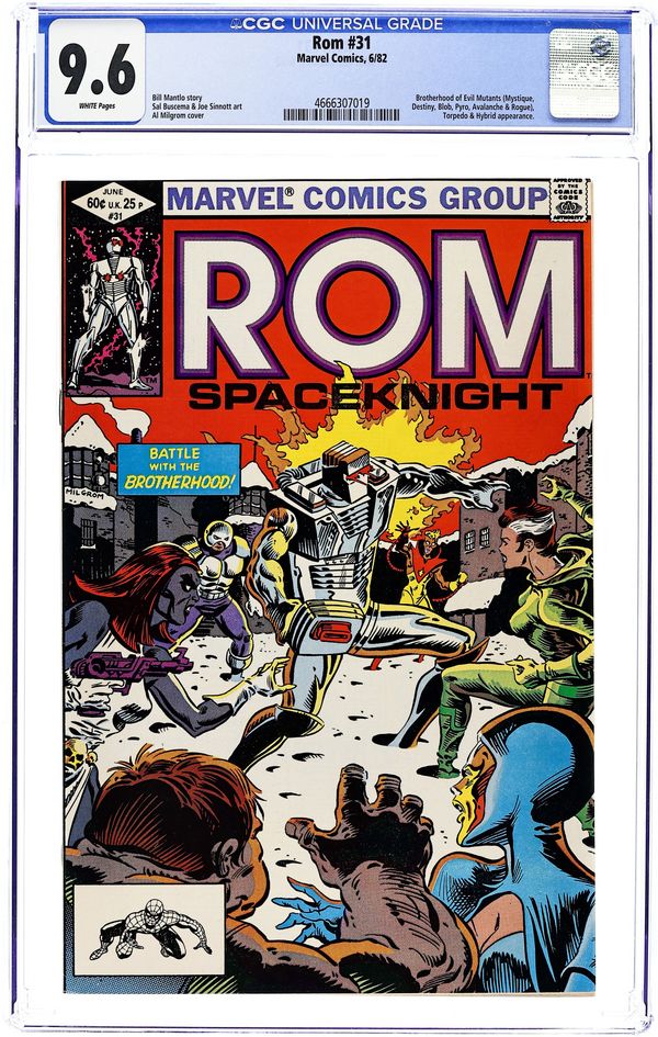 Direct Edition. Story by Bill Mantlo. Art by Sal Buscema and Joe Sinnott. Torpedo fights for his life against the Dire Wraith/human half-breed horror known as Hybrid. Meanwhile, Rom faces off against the Brotherhood of Evil Mutants (Mystique, Rogue, Destiny, Avalanche, Pyro, and the Blob). 32 pages. Cover price $0.60.