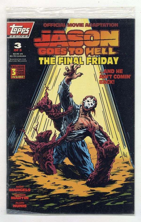 $28.00Polybagged with cards. Cover by Cynthia Martin. Untitled story, script by Andy Mangels, Dean Lorey (Screenplay), and Jay Huguely (Screenplay), pencils by Cynthia Martin, inks by Allen Nunis; Duke reveals to Jessica her destiny and they set out to destroy the entity of Jason Voorhees forever. Conclusion of the Jason Goes To Hell The Final Friday movie adaptation. Andy Mangels Interview with Kane Hodder , the actor who played Jason in Jason Goes To Hell. 36 pgs., full color. $2.95. Cover price $2.95.