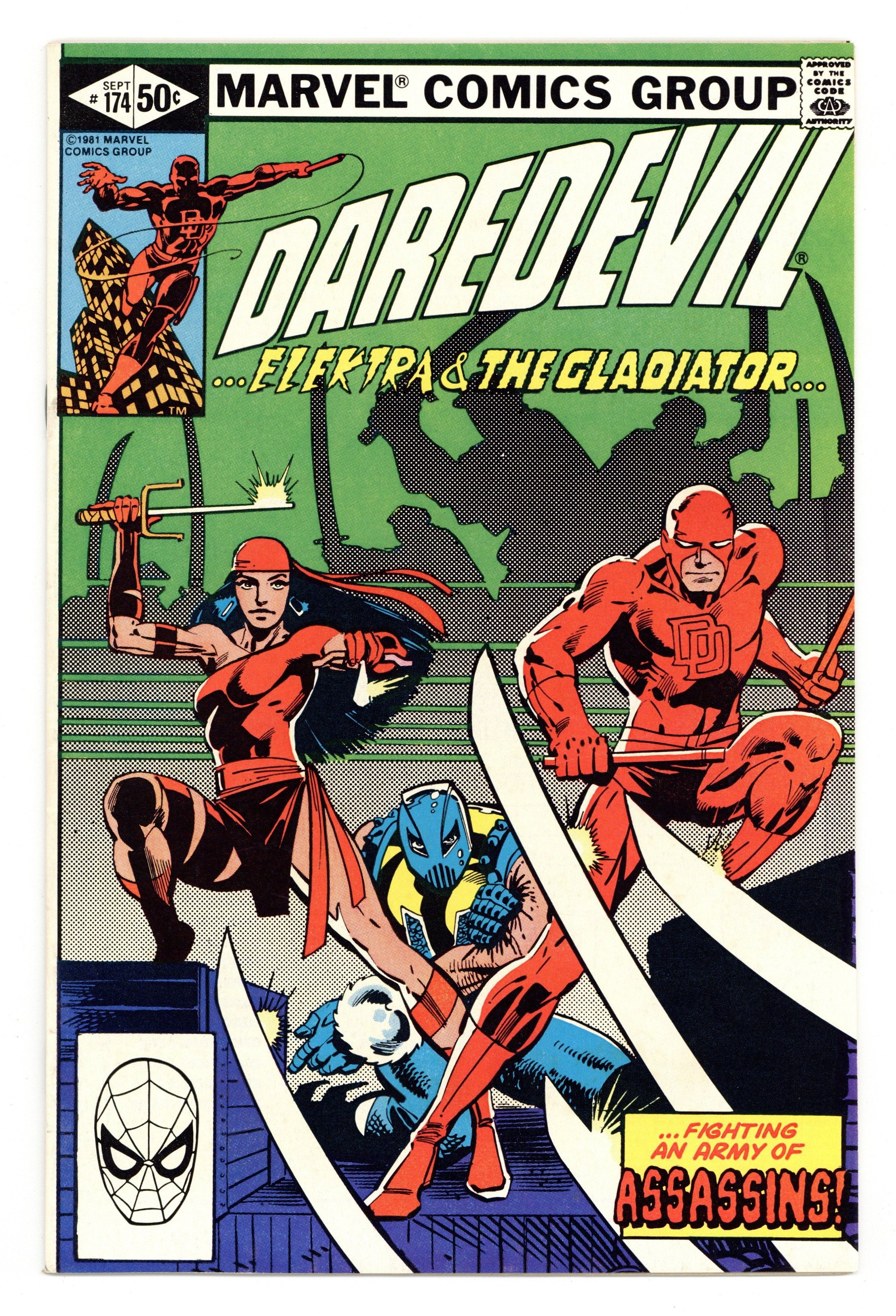 Tags: Marvel Legacy Numbering: Daredevil (part 174), Daredevil$23.50Direct Edition. Cover pencils by Frank Miller, inks by Klaus Janson. Elektra returns in The Assassination of Matt Murdock, script by Frank Miller, pencils by Frank Miller (breakdowns) and Klaus Janson (finished art), inks by Klaus Janson; Kingpin secretly hires the Hand to take out Matt Murdock, but Elektra and Gladiator get in the way; When the Hand blows up his law office, DD loses his radar sense due to the blast; 1st appearance of The Hand (ninja assassins). 36 pgs. Cover price $0.50. Cover price $0.50.