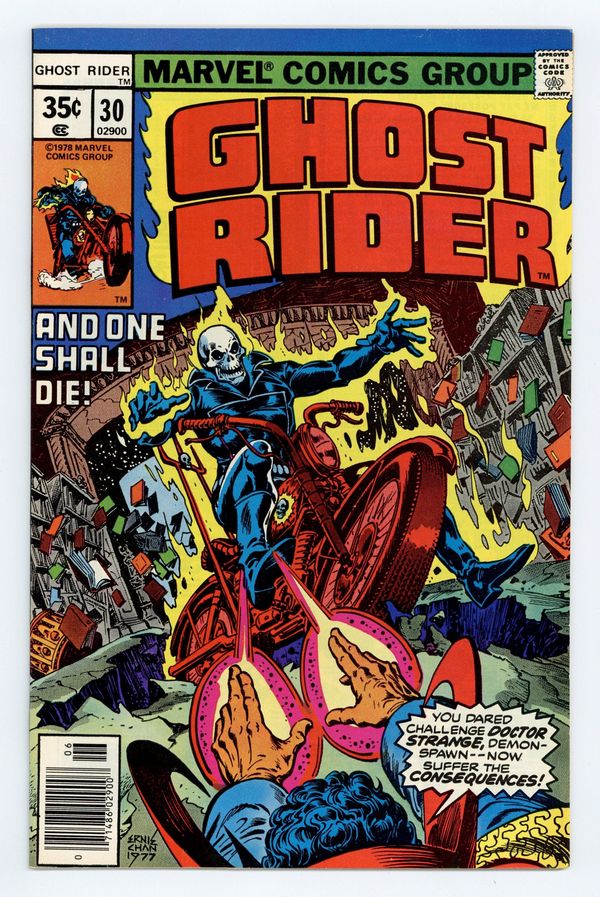 Tags: Doctor Strange, Ghost Rider$16.50Part 2 of 4 - "The Mage and the Monster!" Guest-starring Doctor Strange. Story by Roger McKenzie. Art by Don Perlin and Jim Mooney. Cover by Ernie Chan. The Dread Dormammu has turned the macabre power of the Ghost Rider against his hated foe, Doctor Strange! can the Master of the Mystic Arts find a way to save Blaze's soul, or will he be forced to destroy the Spirit of Vengeance?! 32 pages, FC. Cover price $0.35.
