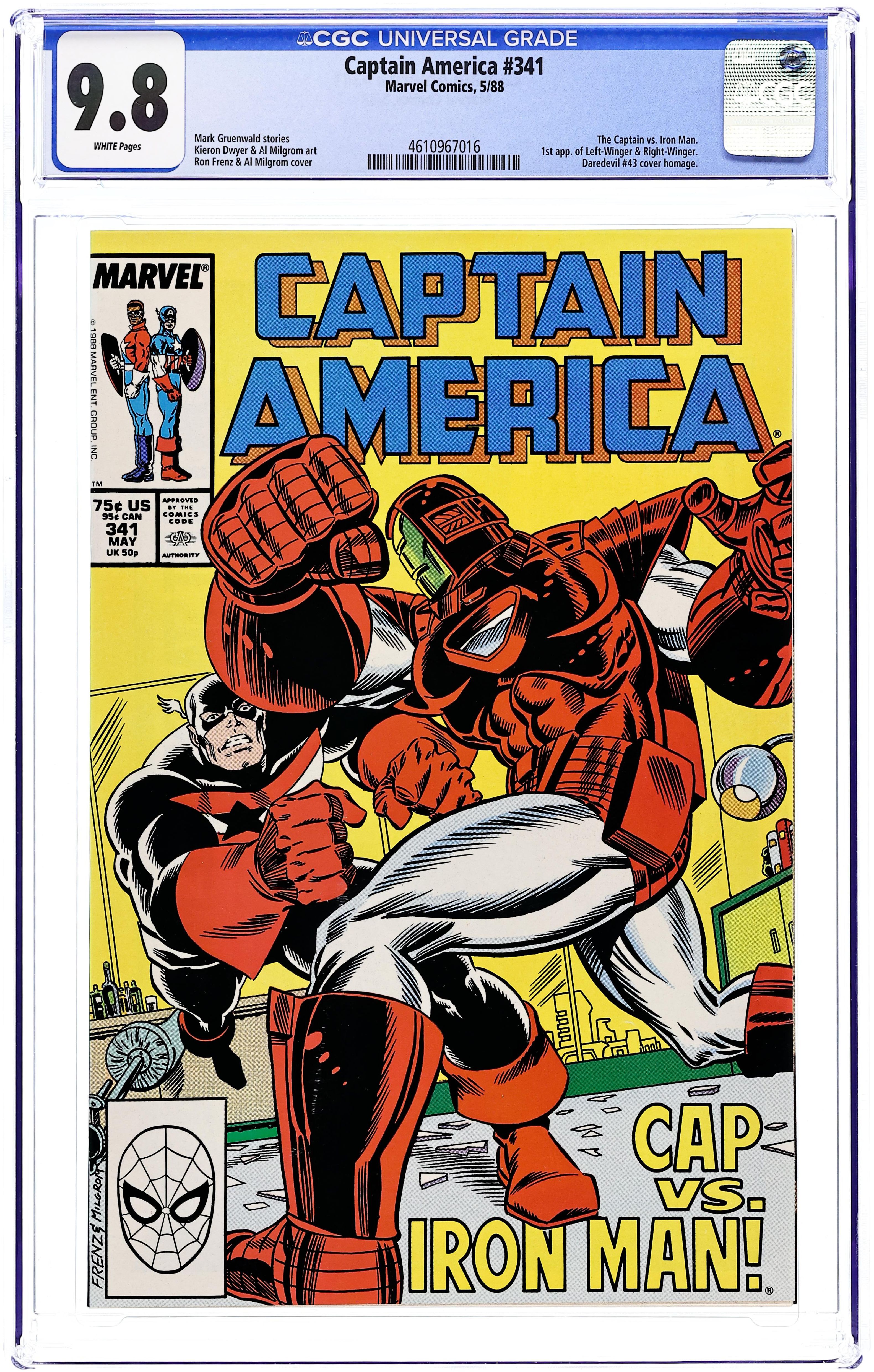 Direct Edition. Iron Man guests in "Break-In" Story by Mark Gruenwald. Art by Kieron Dwyer and Al Milgrom. Cover by Ron Frenz and Al Milgrom. Steve Rogers pays a visit to Tony Stark's pacific mansion so the two men can discuss their unfinished business from the incident at the Vault. Unfortunately, talking does not resolve anything, so it's Iron Man vs. the Captain! First back up story: "Free Speech" Captain America (aka John Walker) and Battlestar (formerly Bucky) appear at a media event at the Washington Monument. Two former partners of John Walker called Left-Winger and Right-Winger jump on stage and reveal the new Captain America's secret identity. Second back up story: "In Our Midst" The Serpent Society is considering adding four new members to their society; however, Sidewinder does not realize that the prospective members are secretly working for the Viper! When the Viper's infiltrators begin to overrun the Serpent Society's headquarters, Diamondback has no choice but to make a phone call for help... to Captain America's hotline! 36 pages Cover price $0.75.