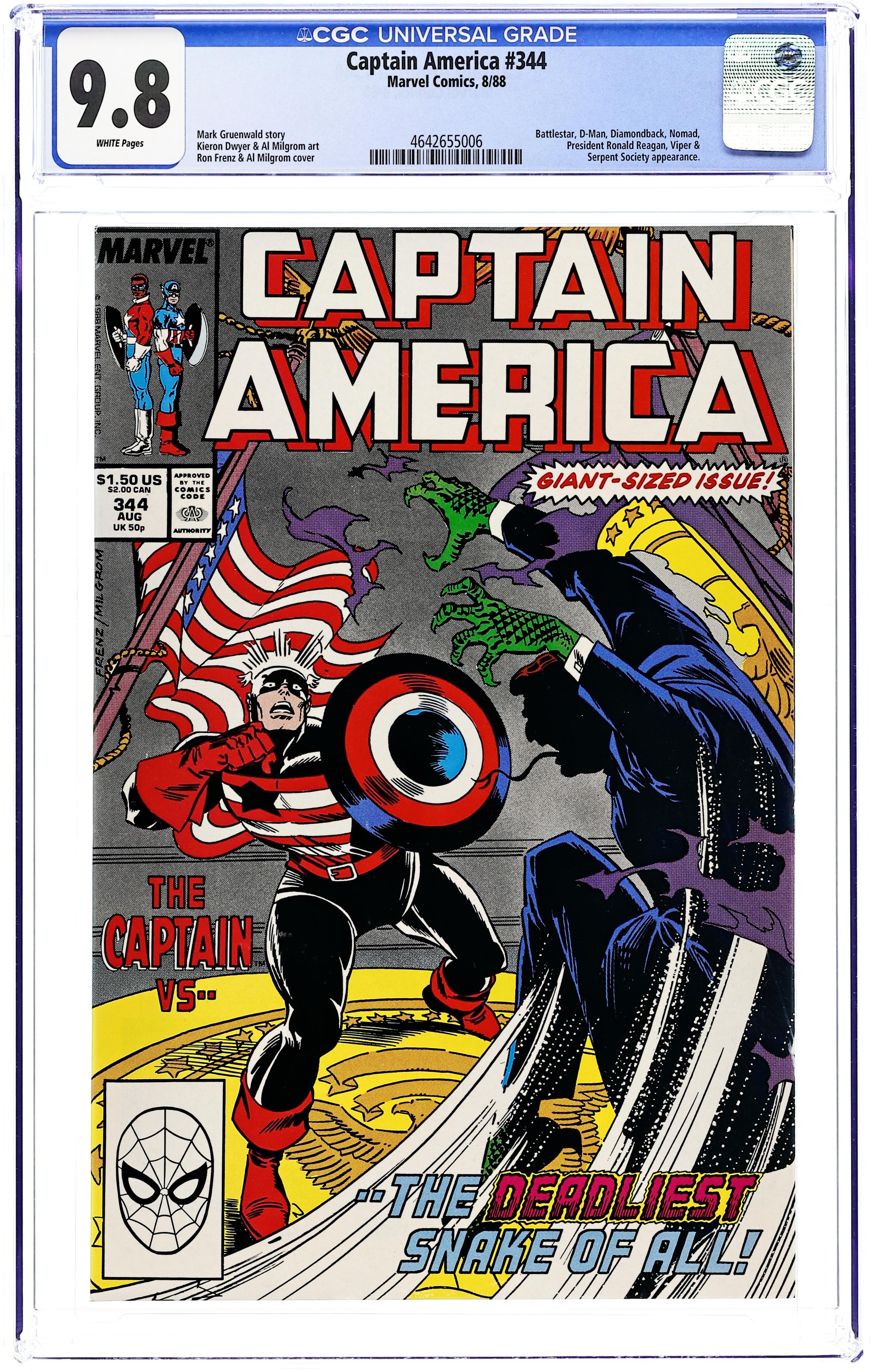 Ronald Reagan cameo; 52-page giant. "Don't Tread On Me!" Giant-size issue. Story by Mark Gruenwald. Art by Kieron Dwyer and Al Milgrom. Cover by Ron Frenz and Al Milgrom. It's chaos in the streets as the residents of Washington D.C. are turning into human serpents after the Cobra, Copperhead, and Boomslang successfully poison the water supply! And now the Viper is storming the White House! The Captain busts into the Oval Office to battle the Viper...and the President? Also in this issue, Captain America (aka John Walker) and Bucky fight Diamondback and the Demolition Man. Cameo appearances by President Ronald Reagan and first lady Nancy Reagan. 52 pages Cover price $1.50.
