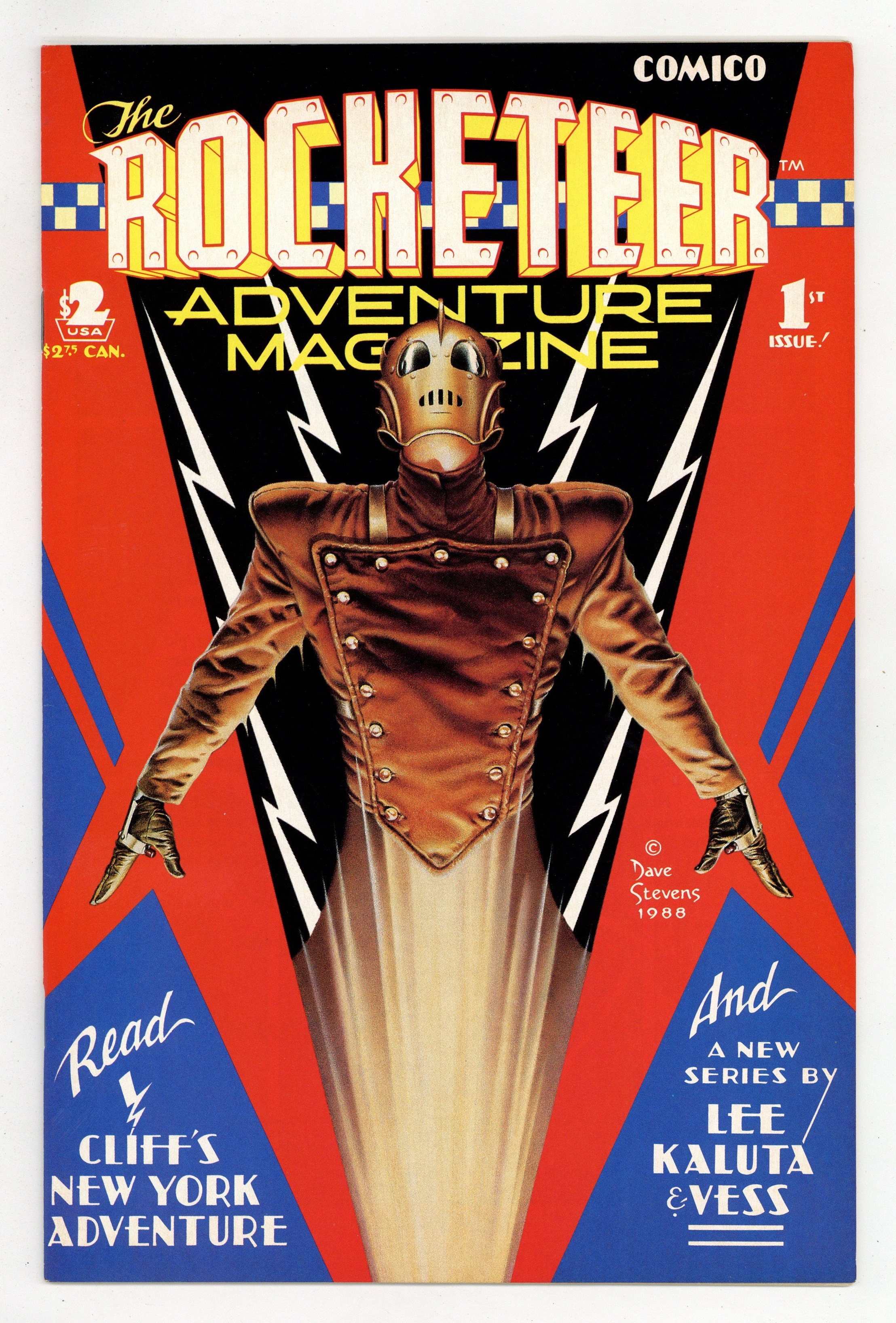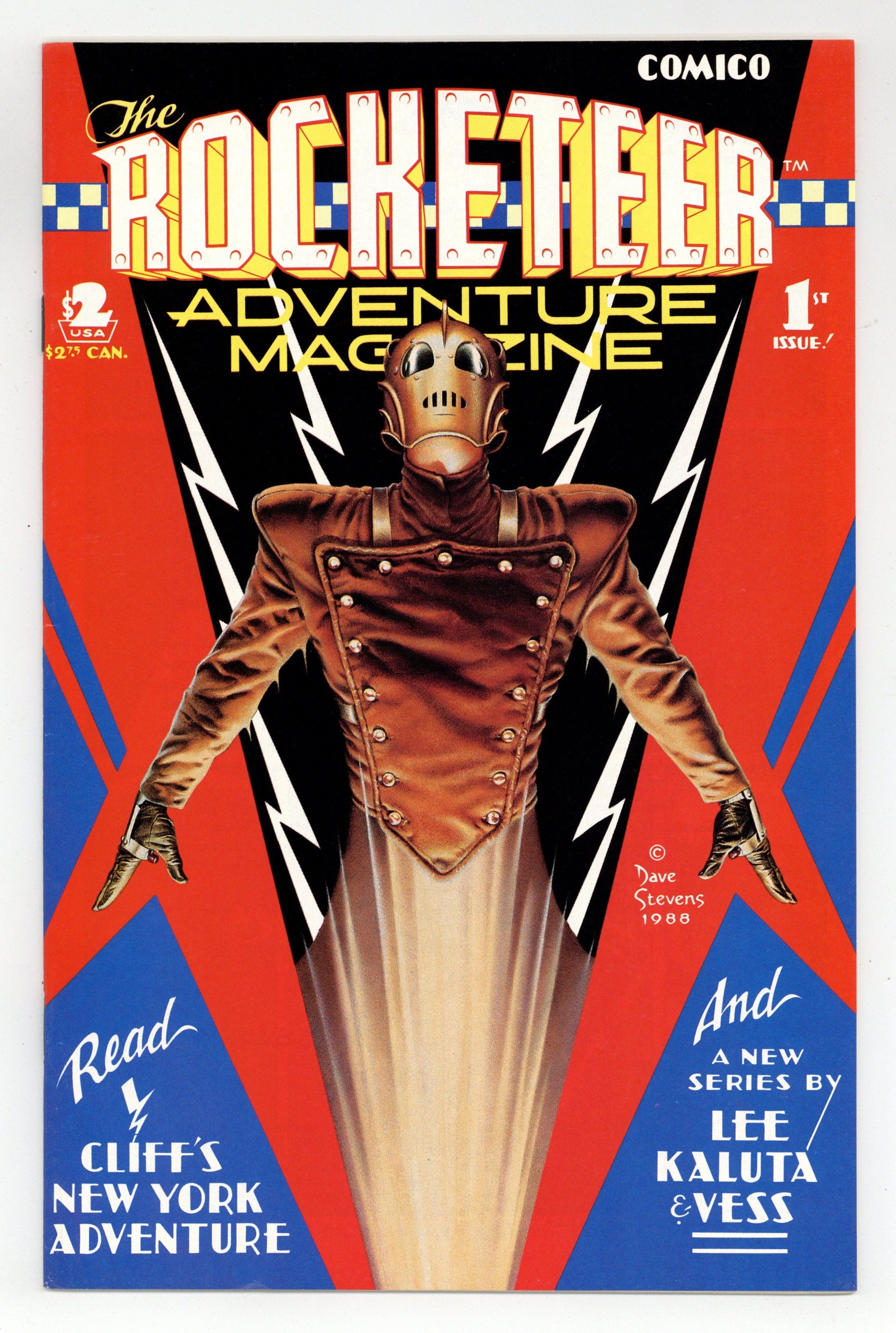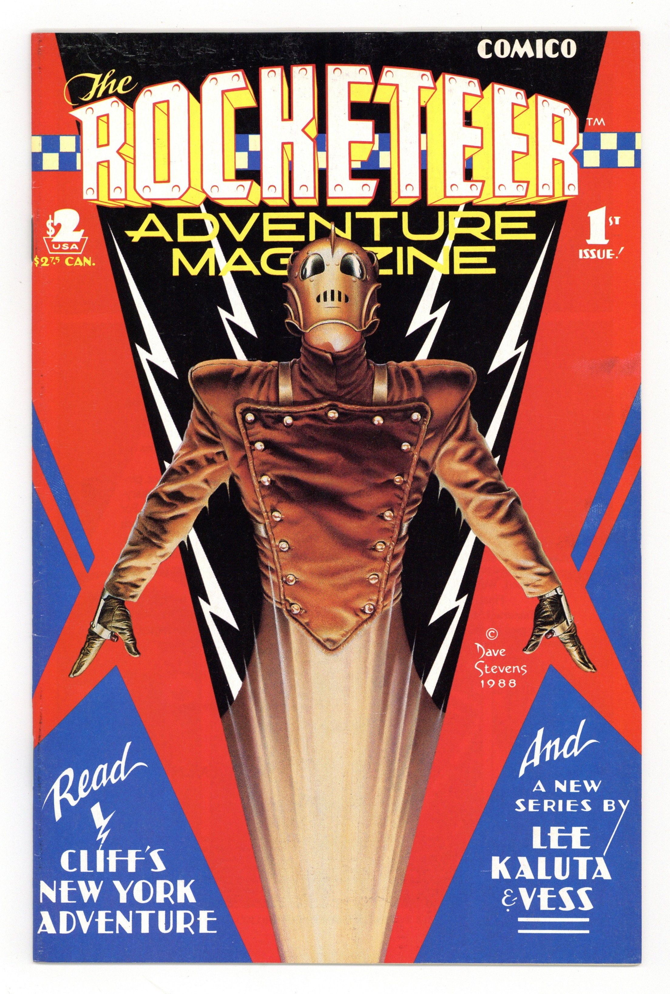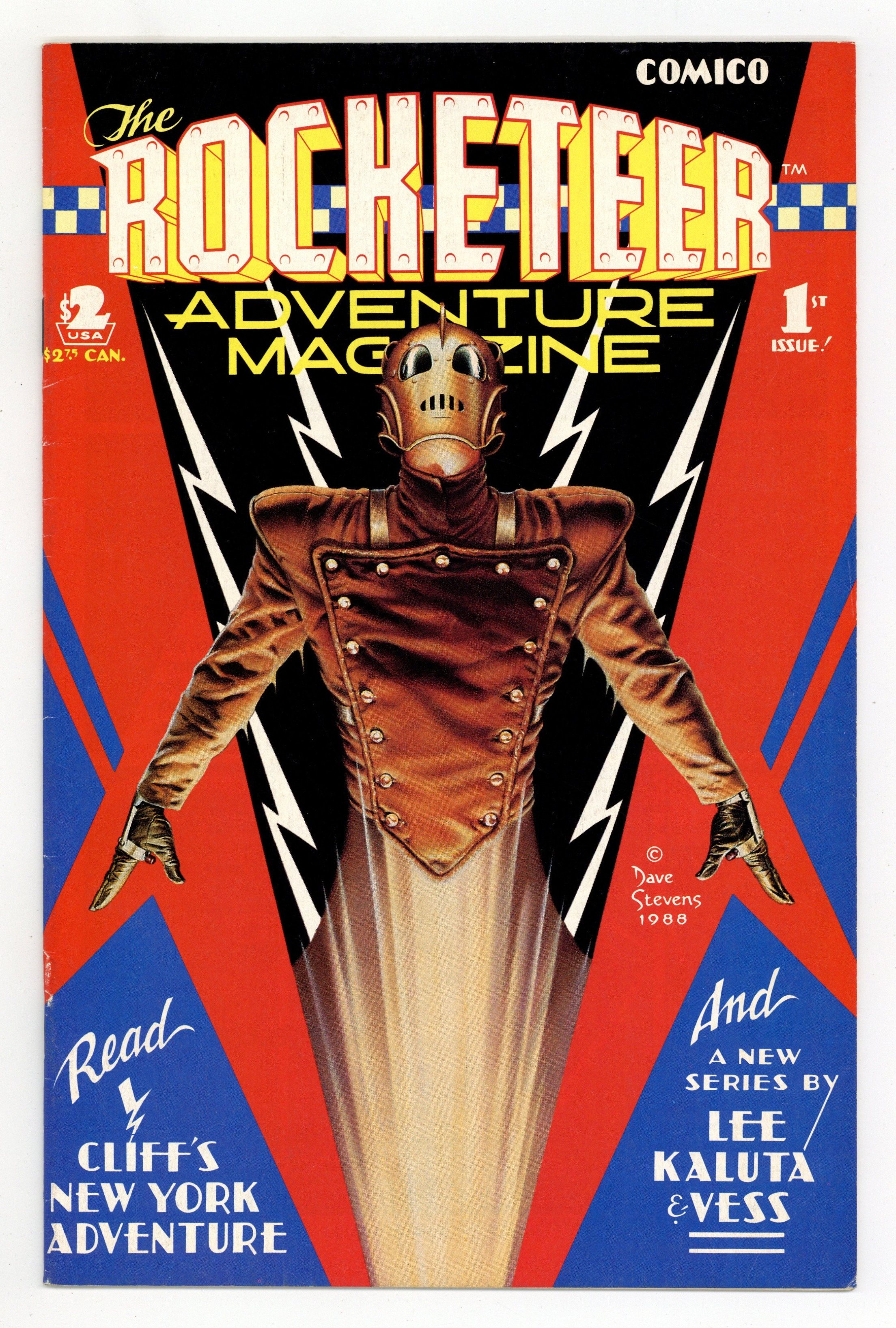 Published Jul 1988 by Comico/Dark Horse.$15.00Cover by Dave Stevens. "Cliffs New York Adventure" 14 pages. Part 6 of 8. Story continues from Rocketeer Special Edition. Story and art by Dave Stevens. Cliff follows Betty to New York before she sets off for Europe. But the reunion might not go exactly as planned. "George Townson. Flying the Autogiros." 4 pages. Text feature. "Buy, Buy, Birdie." 10 pages. Story by Elaine Lee. Pencils by Michael Kaluta. Inks by Charles Vess. Attempting to win a badminton contest, the Galactic Girl Guides develop a birdie shooting robot. Should have left out the real bird eggs though. 32 pages. Full color. Cover price $2.00.