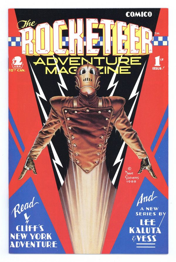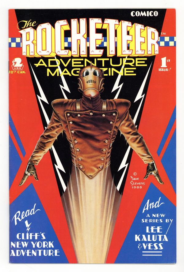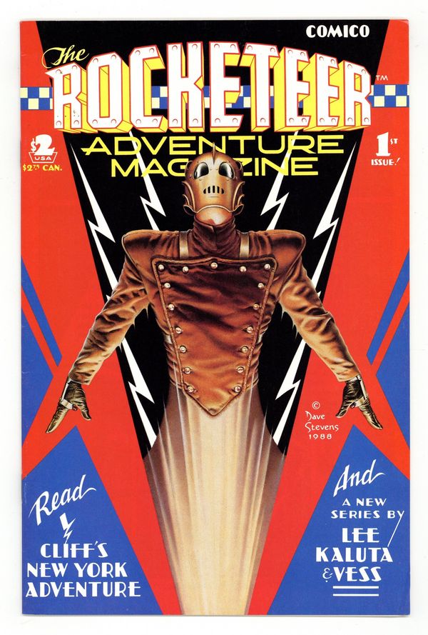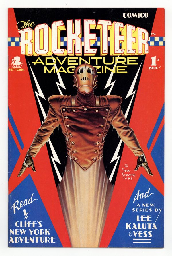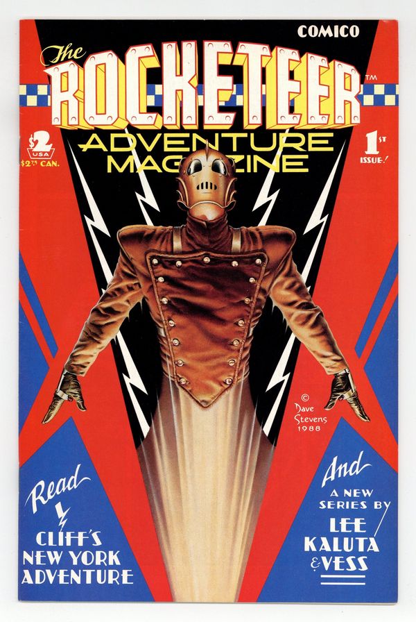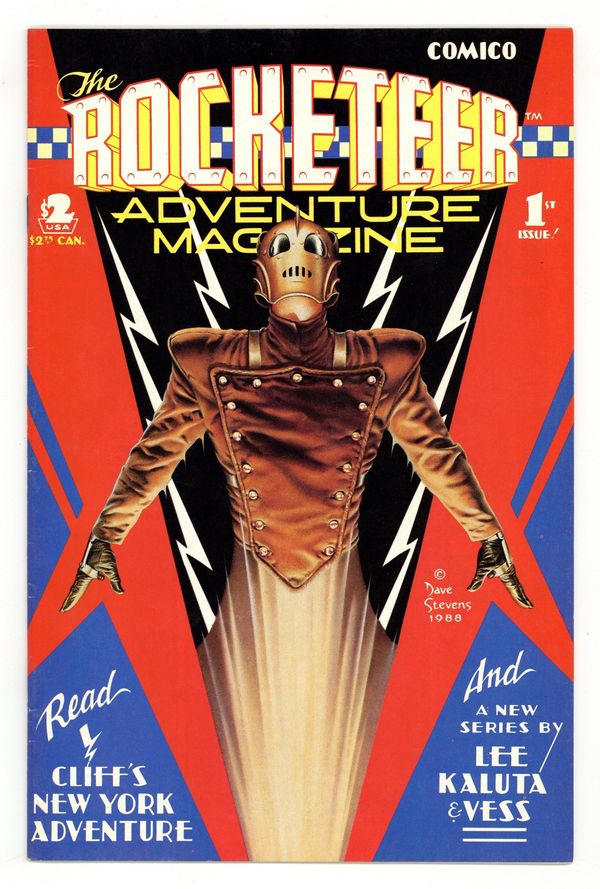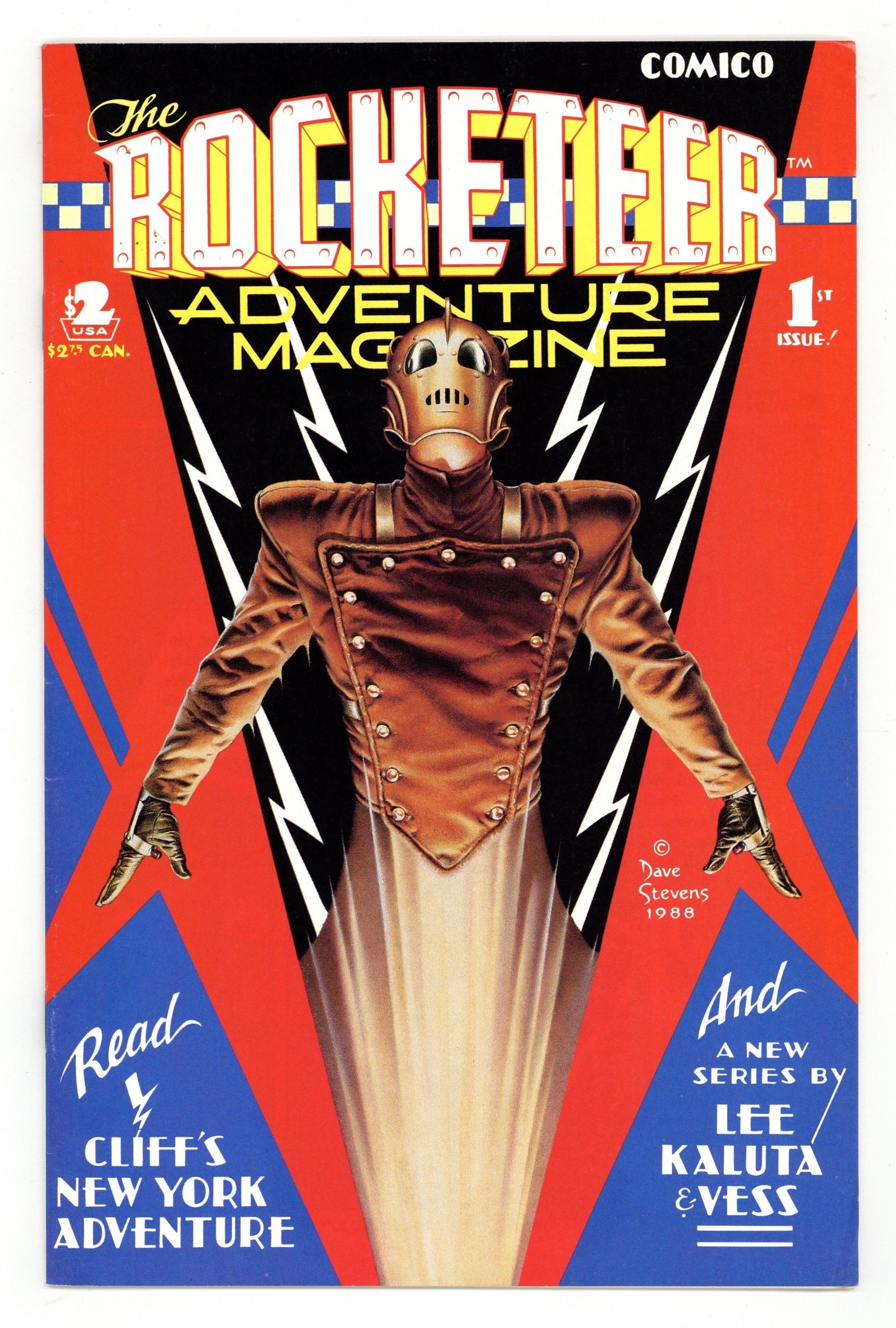 Published Jul 1988 by Comico/Dark Horse.$15.00Cover by Dave Stevens. "Cliffs New York Adventure" 14 pages. Part 6 of 8. Story continues from Rocketeer Special Edition. Story and art by Dave Stevens. Cliff follows Betty to New York before she sets off for Europe. But the reunion might not go exactly as planned. "George Townson. Flying the Autogiros." 4 pages. Text feature. "Buy, Buy, Birdie." 10 pages. Story by Elaine Lee. Pencils by Michael Kaluta. Inks by Charles Vess. Attempting to win a badminton contest, the Galactic Girl Guides develop a birdie shooting robot. Should have left out the real bird eggs though. 32 pages. Full color. Cover price $2.00.
