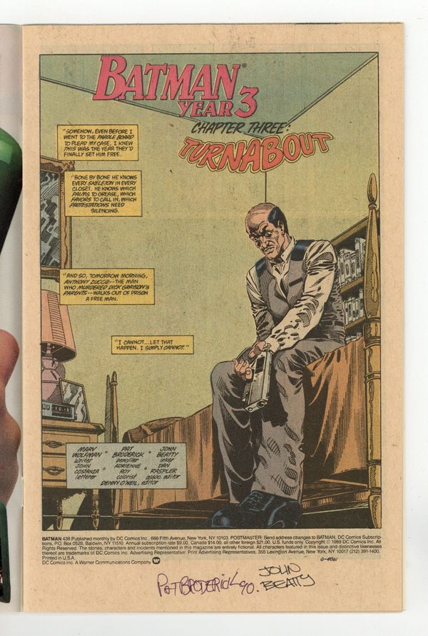 Tags: Batman Year 3 (part 3)$15.00- Signed by John Beatty, and Pat Broderick (both first page). Autograph certification from Legends Comics is included.