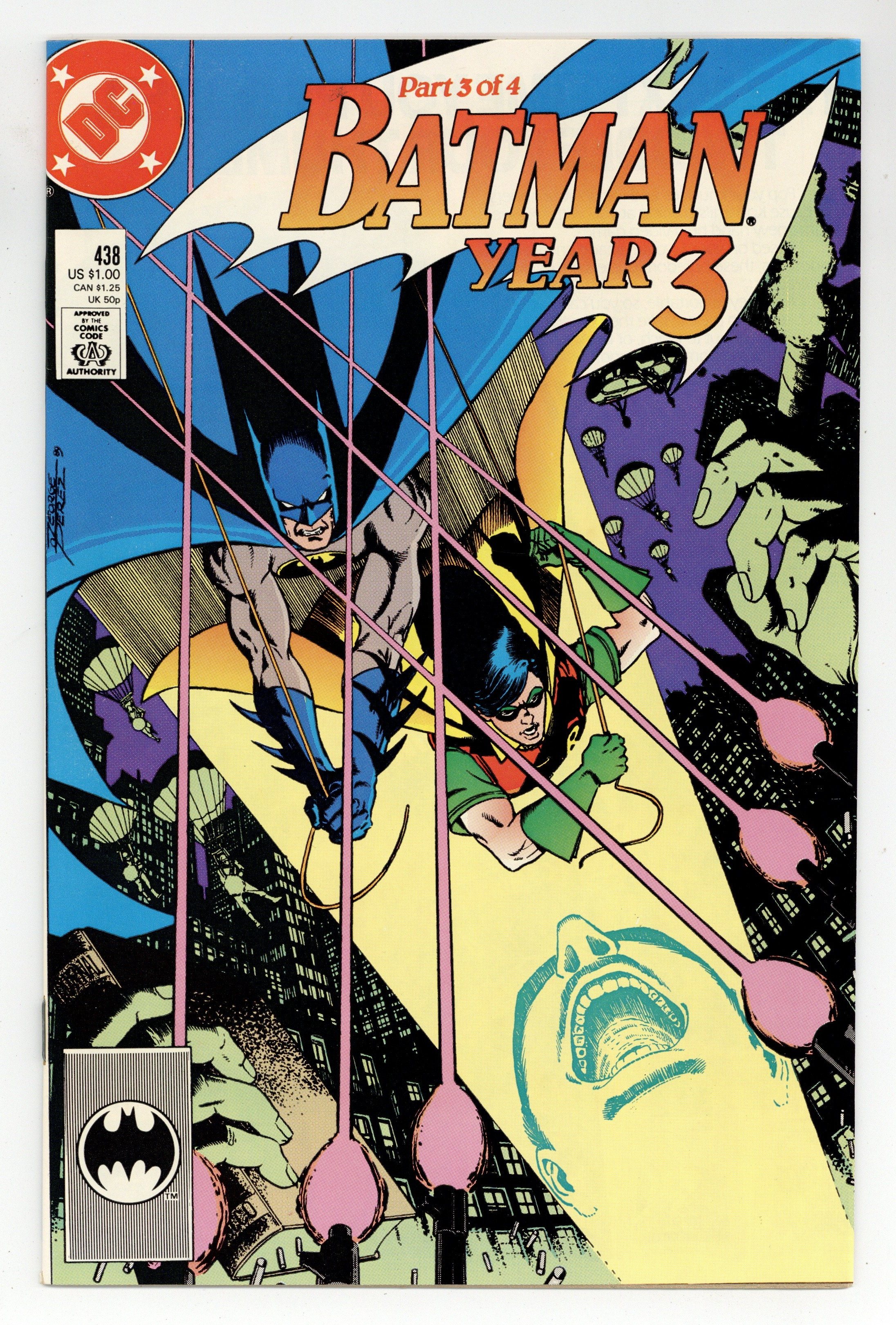 First $1.00 cover price. Cover art by George Perez. "Batman Year 3" (Part 3 of 4): Turnabout," script by Marv Wolfman, pencils by Pat Broderick, inks by John Beatty; Alfred cannot bring himself to kil Boss Zucco and tries to bribe him to leave Gotham; Batman and Nightwing separately discover that Zucco will be released that night; The suspect hes connected to the recent mob killings. The Post-Crisis origin of Robin (Dick Grayson) in flashback. Story continues in Batman #439. 36 Pages, Full Color. Cover price $1.00.