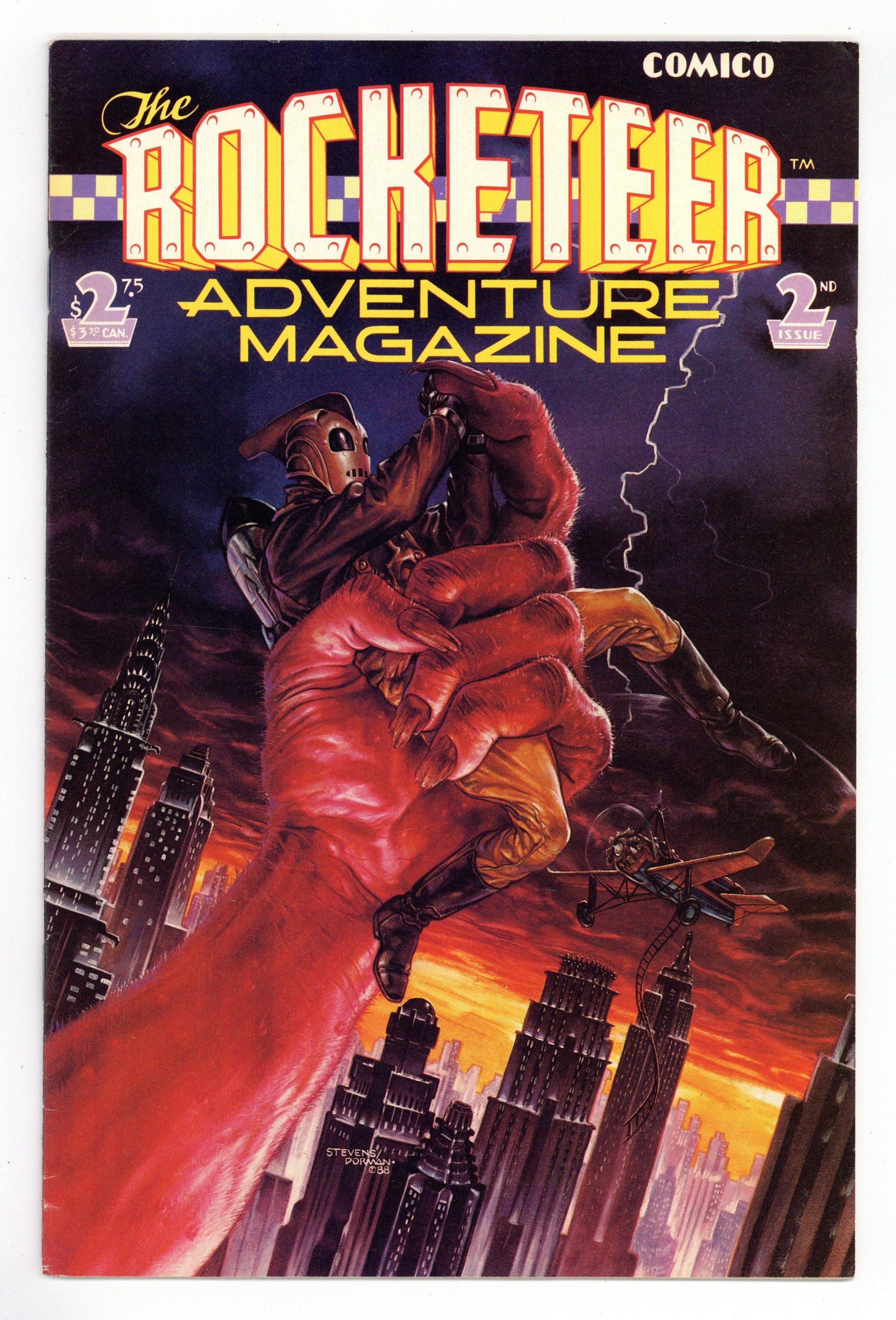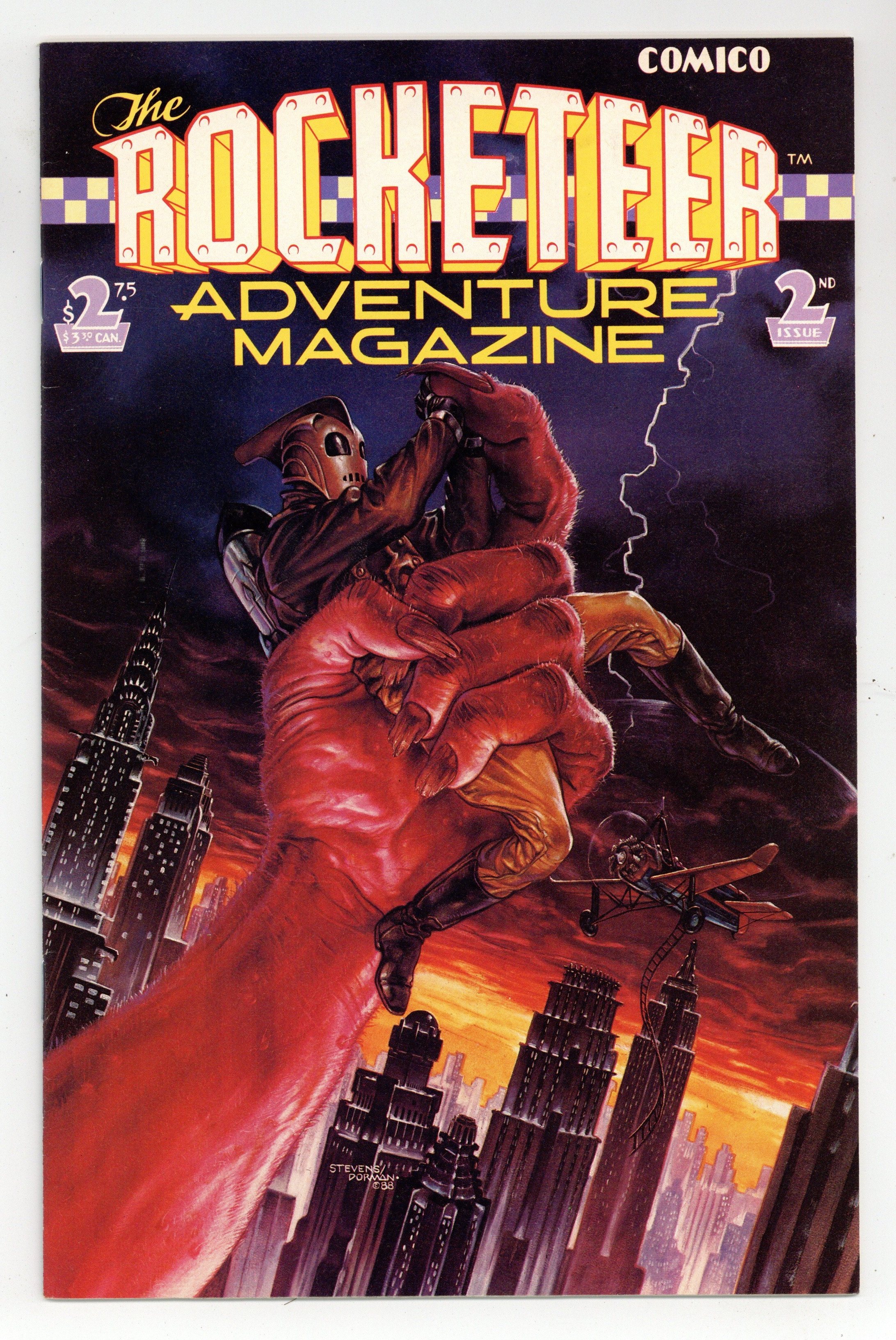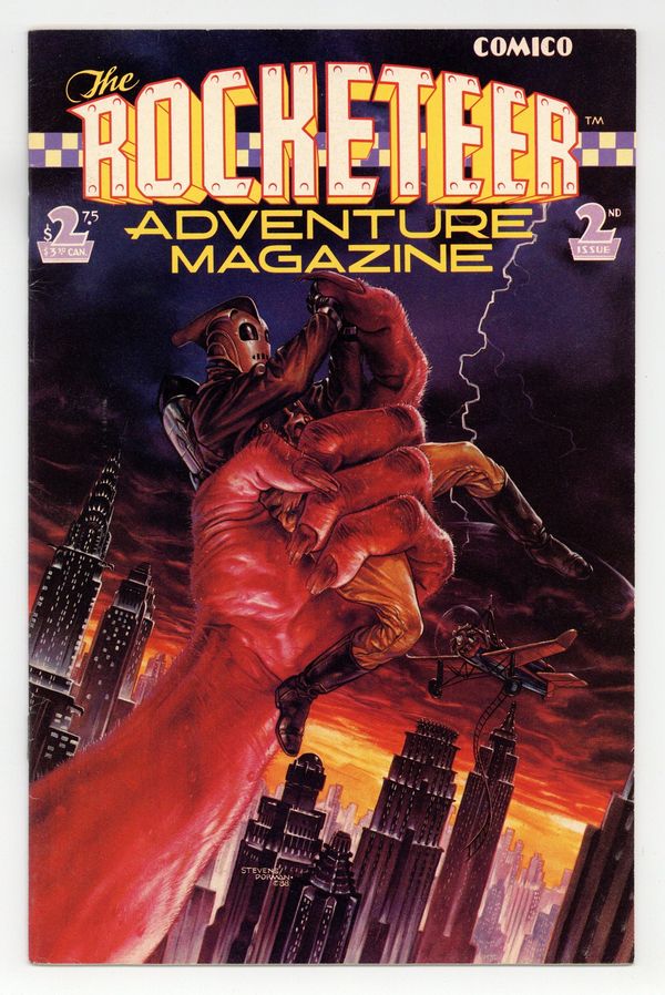 Published Jul 1989 by Comico/Dark Horse.$6.00Cover by Dave Stevens and Dave Dorman. "Nightmare at Large." 14 pages. Part 7 of 8. Story by Dave Stevens, Paul DeMeo and Danny Bilson. Layouts by Mike Kaluta. Art by Dave Stevens. Cliffs shadowy new colleague sends him on a mission to track down a killer who is murdering members of a circus troupe Cliff once belonged to. "Pitcairns Autogiro." 3 pages. Text feature. "All Souped Up and Nowhere to Blow." 10 pages. Story by Elaine Lee. Art by Michael Kaluta. Hi-jinks abound as the Galactic Girl Guides prepare their entry for the Soup Can Rally. All the while making sure those dumb Boy Scouts dont steal their ideas. 32 pages. Full color. Cover price $2.75.
