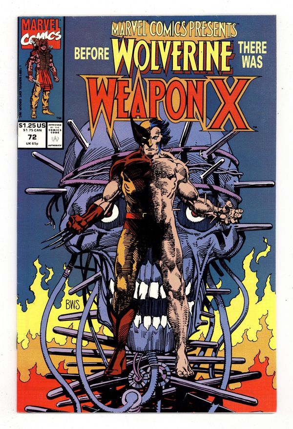 Tags: Wolverine Weapon X (part 0), Anthology / Collection$16.00Direct Edition. Wolverine in Weapon X: Prologue - by Barry Windsor-Smith (script, cover, and art); Shanna the She-Devil in "The Bush of Ghosts - Part 5: Ant Hills of the Savannah" by Gerard Jones (script) & Paul Gulacy (art); Daredevil in "Redemption Song - Part 4: A Momentary Taste of Being" by Sandy Plunkett (script & art) & Dwayne Turner (art); Red Wolf in "Flesh of My Flesh" by Fabian Nicieza (script) & Javier Saltares (art); Bengal, Lobo (wolf partner of Red Wolf) appearance. Cover price $1.25.