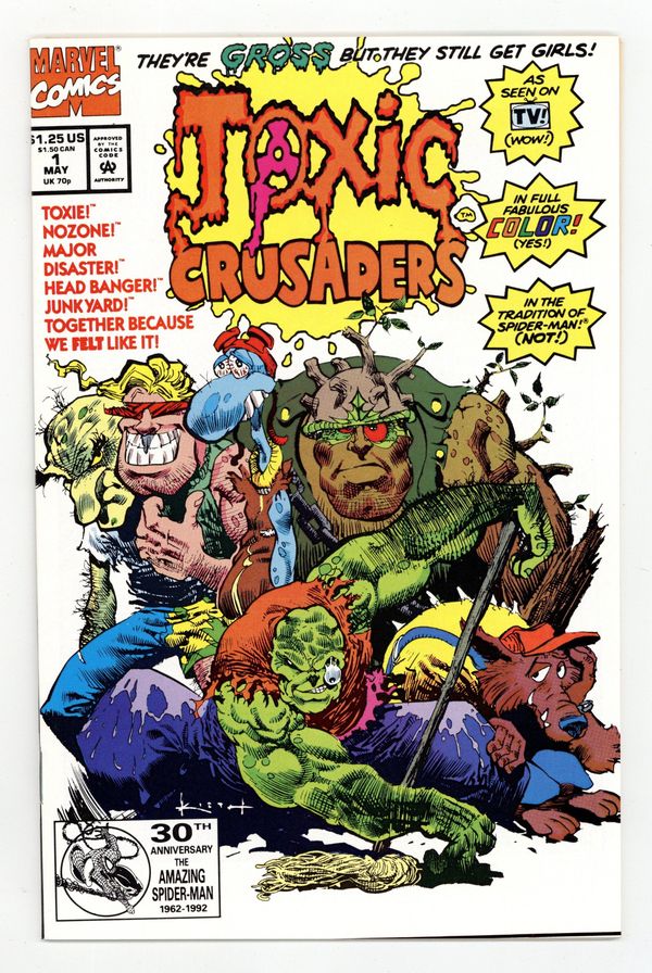 Cover by Sam Kieth. The Making of Toxie, script by Simon Furman, art by Derek Yaniger and Marie Severin; The origin story of how the Toxic Avengers came to exist. "The Toxic Avenger" film spawned this tongue-in-cheek cartoon series with an environmental message about mutated crime fighters who battle the menacing Dr. Killemoff. 36 pgs., full color. $1.25. Cover price $1.25.