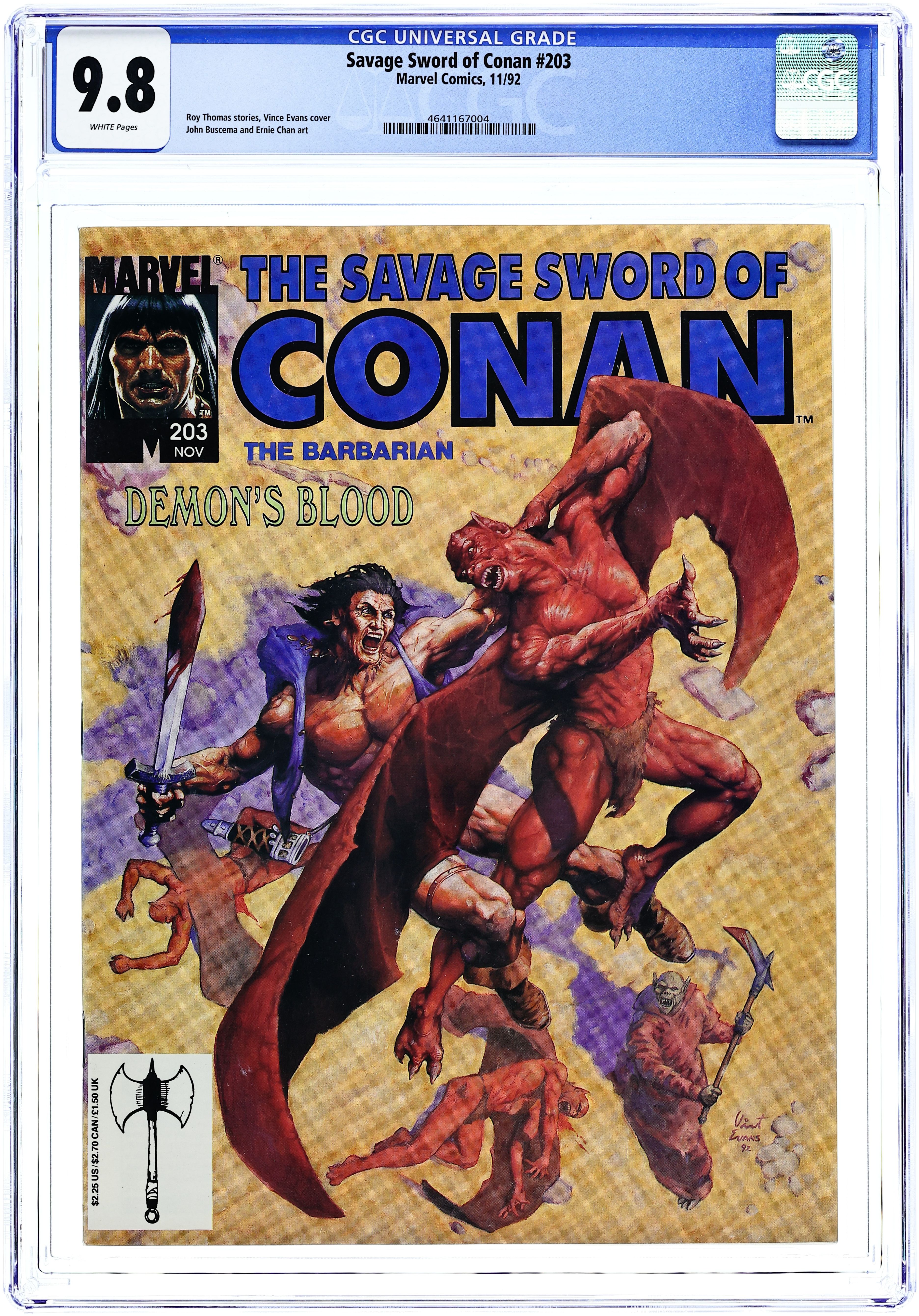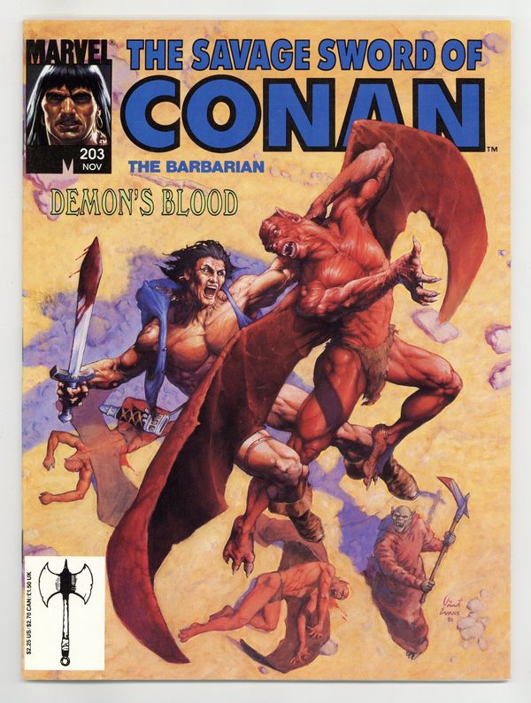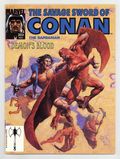 Conan continues his quest with the demon Imhotep in "Marauders in Meroe." By Roy Thomas, John Buscema, and Ernie Chan. This issue also features young Conan in "Old Garrad's Heart" based on a short story by Robert E. Howard. Adapted by Roy Thomas and Sandau. Vince Evans front cover. Cover price $2.25.