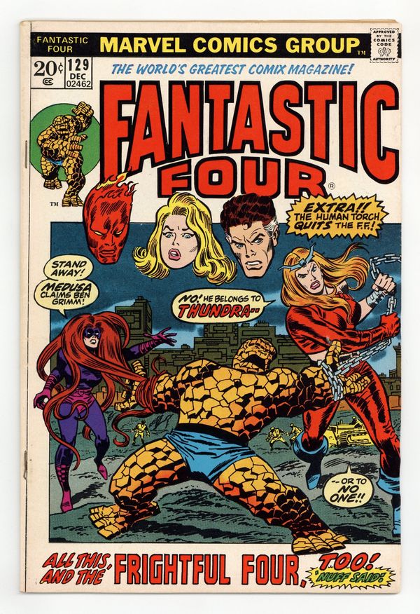 Tags: Fantastic Four$35.50"The Frightful Four...Plus One!" Part 1 of 2. Guest-starring Medusa and Thundra (first appearance). Script by Roy Thomas. Pencils by John Buscema. Inks by Joe Sinnott. Cover by John Buscema, Frank Giacoia, and John Verpoorten. The Fantastic Four have returned to the Baxter Building after finishing their adventure with the Mole Man last issue. But things don't remain quiet for long as Johnny surprisingly announces his intention to go to the Great Refuge! And in a flash the Human Torch departs for the Hidden Land to see Crystal! Moments later another bombshell drops when Agatha Harkness informs Reed and Sue that she can no longer take care of young Franklin. After all the outbursts, Ben decides to go for a walk across town to clear his head. However, he walks right into a battle between the past and present members of the Frightful Four! At an abandoned construction site, Ben Grimm and Medusa fight for their lives against the Sandman, Trapster, Wizard, and Thundra! First appearance of Thundra. Cameo appearance by Black Bolt. 36 pages Cover price $0.20.