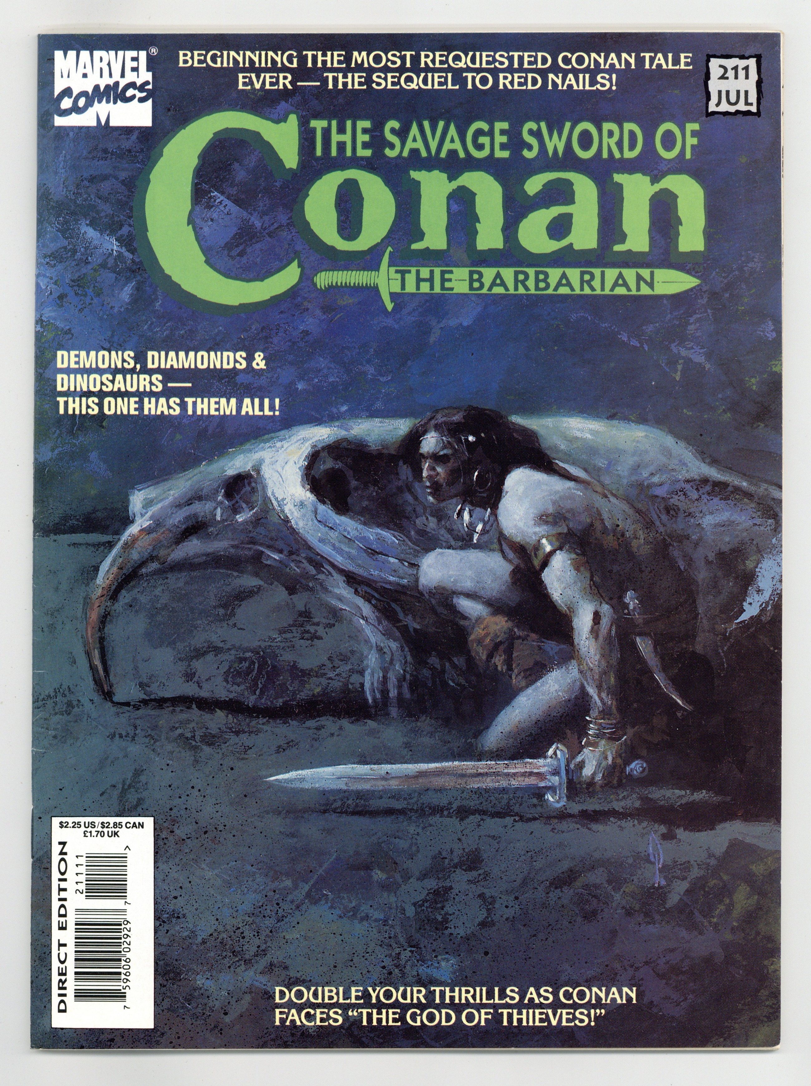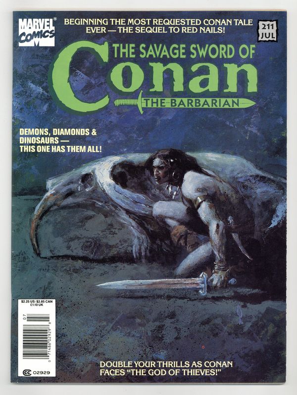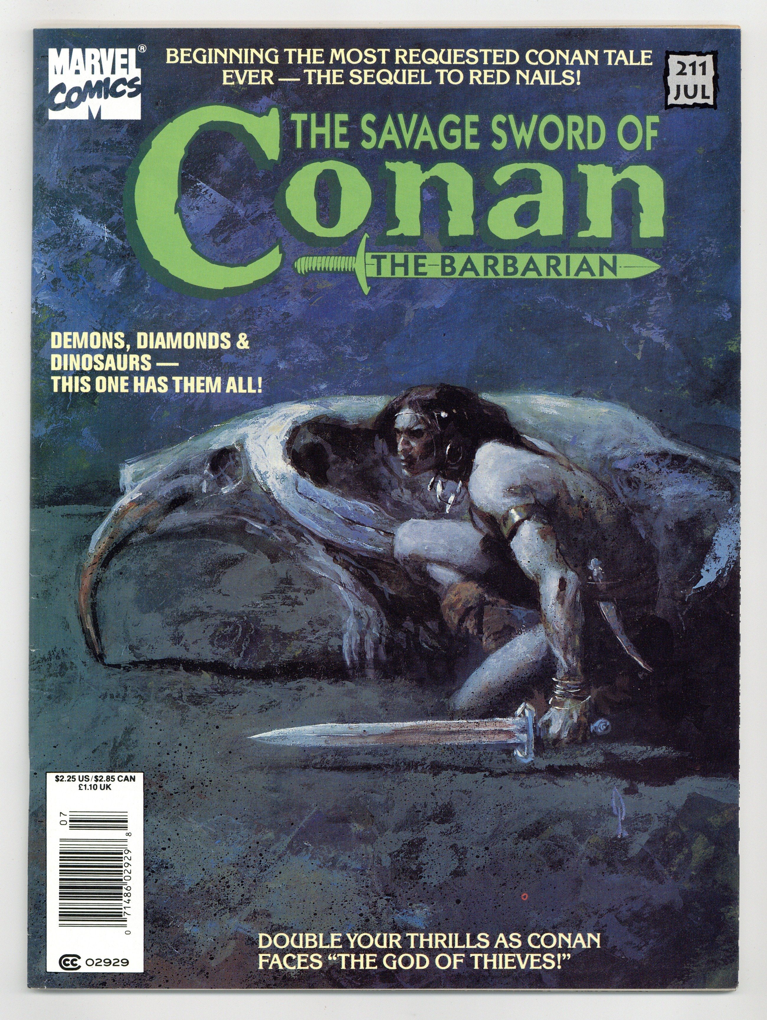 $16.75Conan stars in "The Gods Above, the Beasts Below." Script by Roy Thomas, art by Rafael Kayanan. This is part 1 of an adaptation of "Conan and the Gods of the Mountain" by Roland Green, a sequel to "Red Nails." Back-up story, "The God of Theves" part 1. Script by James Rose, art by Ernie Chan. Three double-page pin-ups by Alfredo Alcala (one including Red Sonja). George Pratt cover. Cover price $2.25.