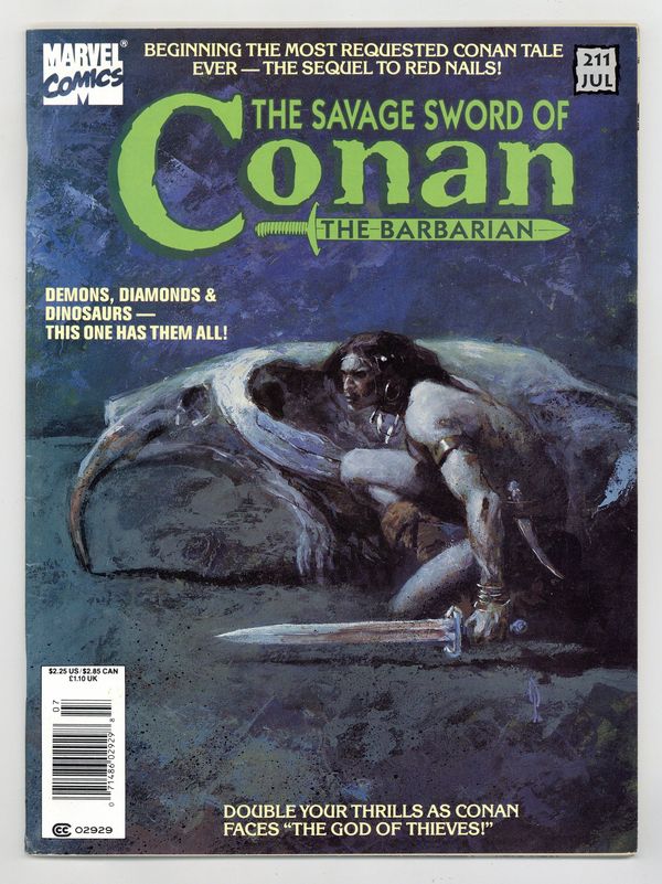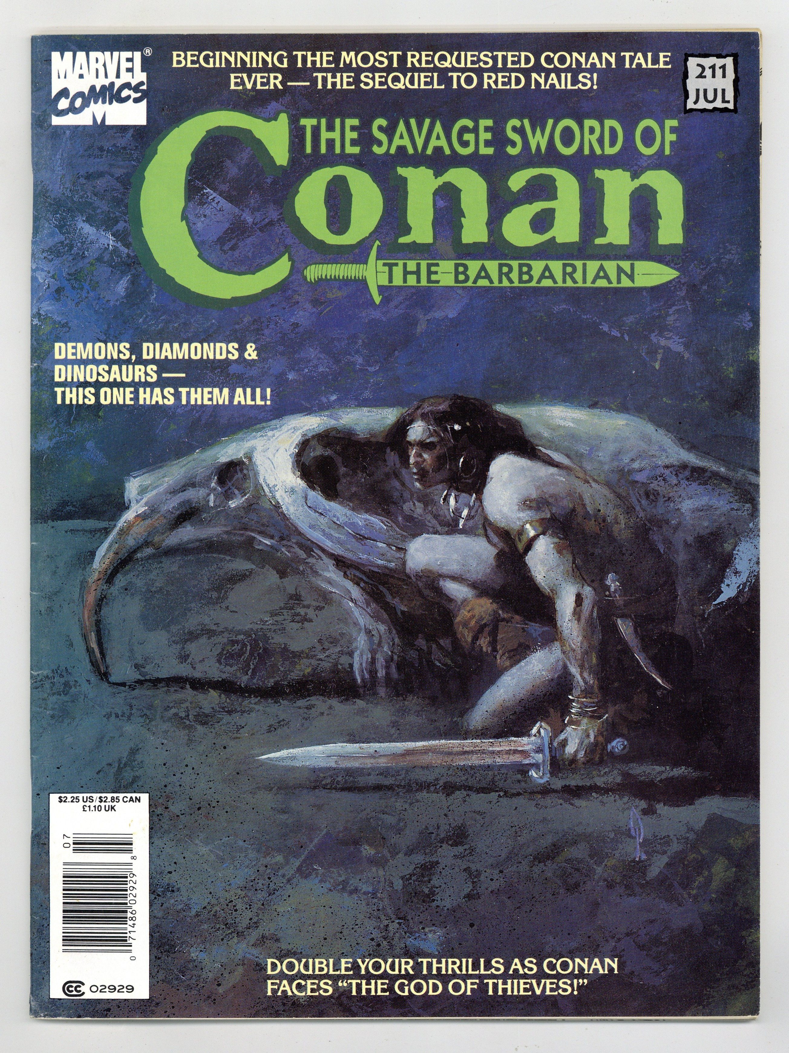 $10.50Conan stars in "The Gods Above, the Beasts Below." Script by Roy Thomas, art by Rafael Kayanan. This is part 1 of an adaptation of "Conan and the Gods of the Mountain" by Roland Green, a sequel to "Red Nails." Back-up story, "The God of Theves" part 1. Script by James Rose, art by Ernie Chan. Three double-page pin-ups by Alfredo Alcala (one including Red Sonja). George Pratt cover. Cover price $2.25.