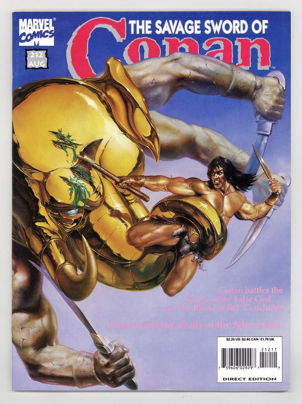 Conan stars in "To Live as Gods, to Die as Men." Script by Roy Thomas, art by Rafael Kayanan. This is part 2 of the adaptation of "Conan and the Gods of the Mountain" by Roland Green, the sequel to "Red Nails." Back-up story, "The Blood of Bel." Plot by James Rose, script by Roy Thomas, art by Ernie Chan. Pin-ups by Tom Grindberg (4) and Esteban Maroto (2). Article on the art of Julie Bell. Bell cover. Cover price $2.25.