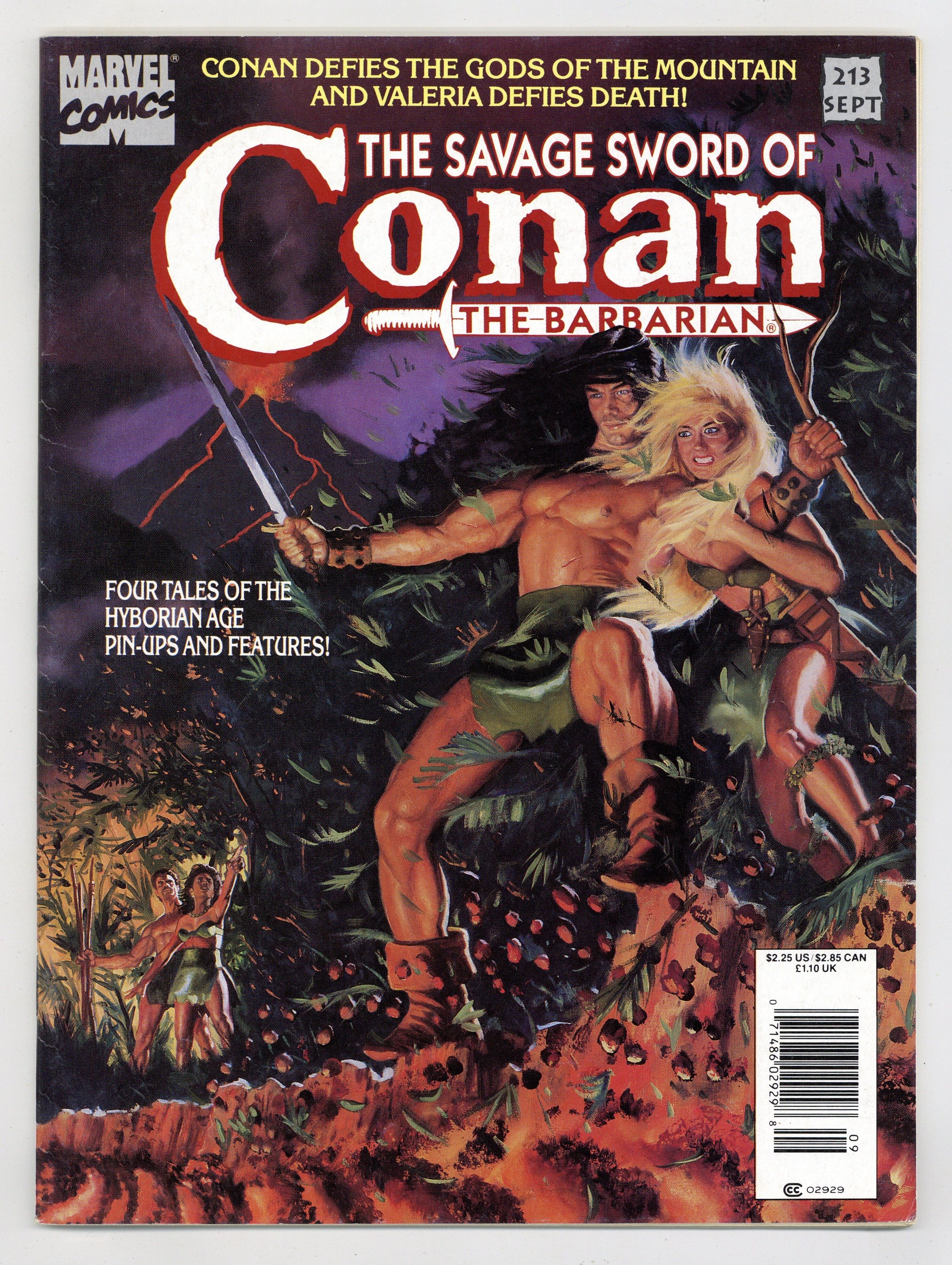 Conan stars in "Death Has Four Corners." Script by Roy Thomas, art by Rafael Kayanan. This is part 3 of the adaptation of "Conan and the Gods of the Mountain" by Roland Green, the sequel to "Red Nails." "Thief in the Night." Script by Don Kraar, art by Dave Simons. "Daughter of the Western Sea." Script by Doug Murray, pencils by Andrea Coates, inks by Sandu Florea. King Kull stars in "Conscience of the King." Script by Charles Dixon, pencils by Eliot Brown, inks by Armando Gil. Article, "Barbarian Banquet" by Jim Neal. Article on the production of the cover by Sue Chan. Pin-ups by Fred Harper and Abrams/Abel. Jim Hoston cover. Cover price $2.25.