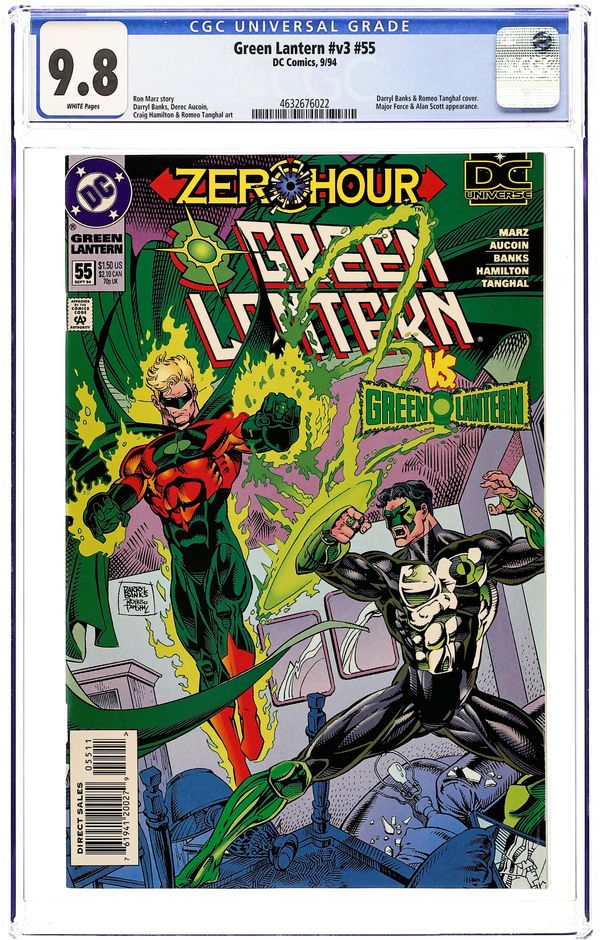 Direct Edition. Zero Hour tie-in. "Assault & Battery!" Part 2 of 2. Guest-starring Green Lantern (Alan Scott). Superman cameo. Story by Ron Marz. Art by Craig Hamilton, Derec Aucoin, Darryl Banks, and Romeo Tanghal. With his power gone, how will Kyle survive his confrontation with the ruthless Major Force, the man who murdered his girlfriend? Plus, the new Green Lantern meets the first man to bear his mantle - Alan Scott! Story continued in Zero Hour: Crisis in Time (1994) #4. Cover price $1.50.