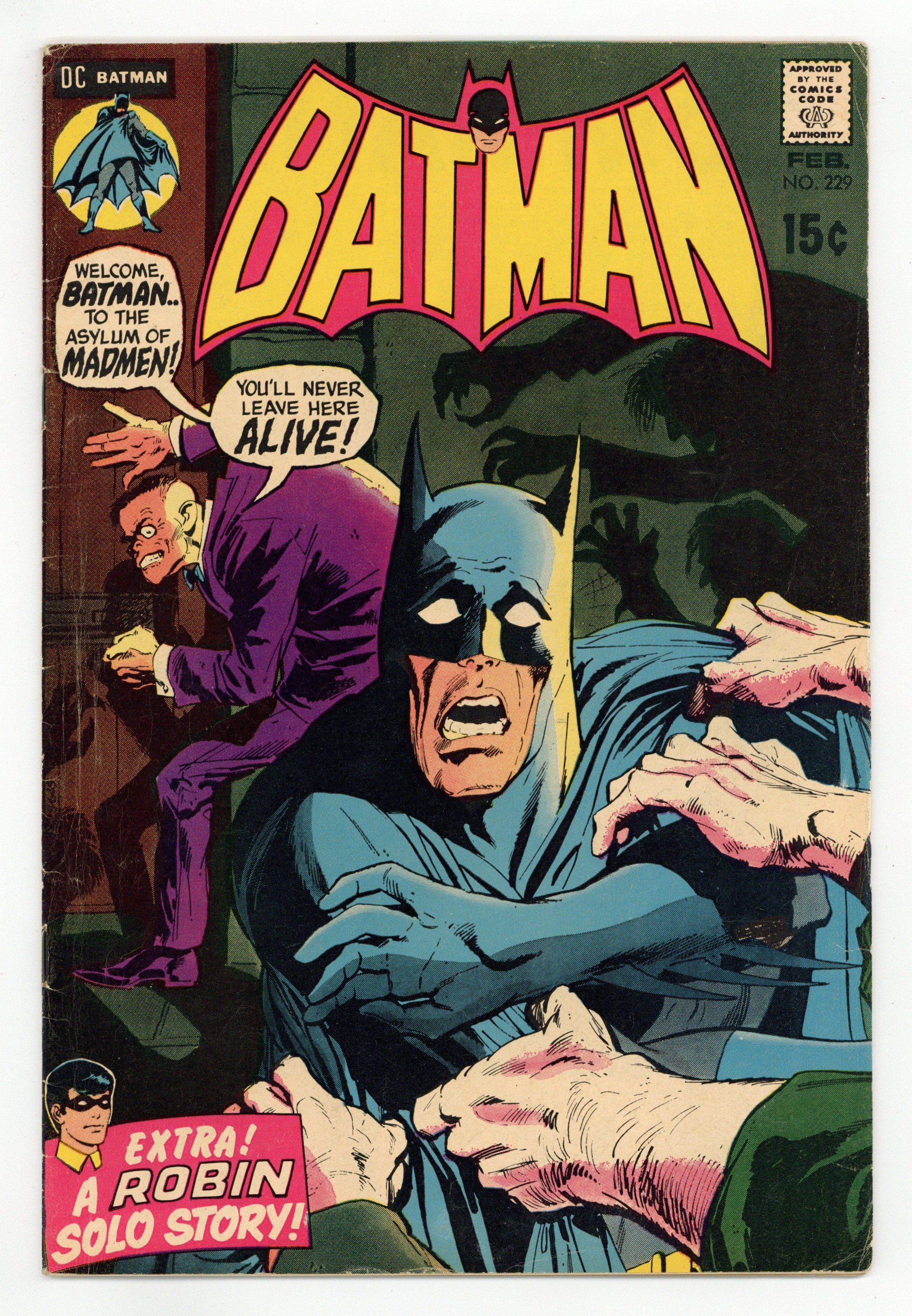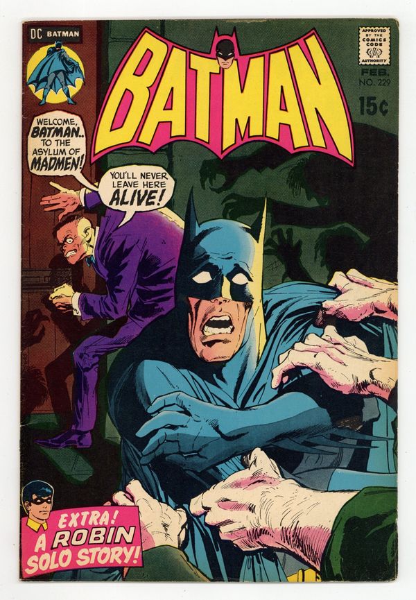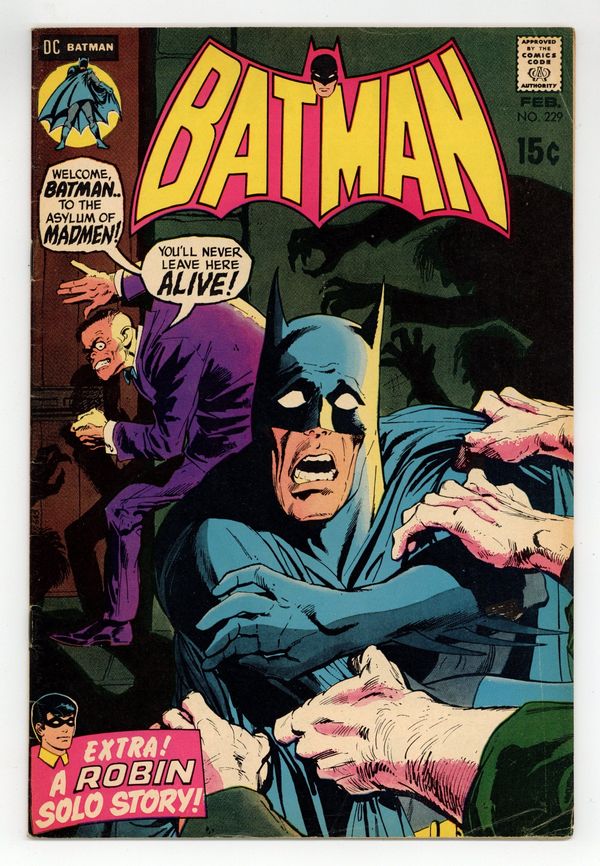 Tags: Batman$72.00Cover pencils by Neal Adams, inks by Dick Giordano. "Asylum of the Futurians!", script by Robert Kanigher, pencils by Irv Novick, inks by Dick Giordano; Late one night, on a road on the outskirts of Gotham City, Batman finds a young woman who is trying to find someone to save her husband who has been abducted by a strange group of people. "Temperature Boiling... and Rising!", script by Mike Friedrich, pencils by Irv Novick, inks by Frank Giacoia; Robin discovers the truth behind a fake photo of candidate Stuart and who burned down his campaign headquarters. Fantastic Fingerprints! filler page; 3 panel illustrations with accompanying text. Letter to the editor from comics writer Mike Barr. 36 Pages, Full Color. Cover price $0.15.
