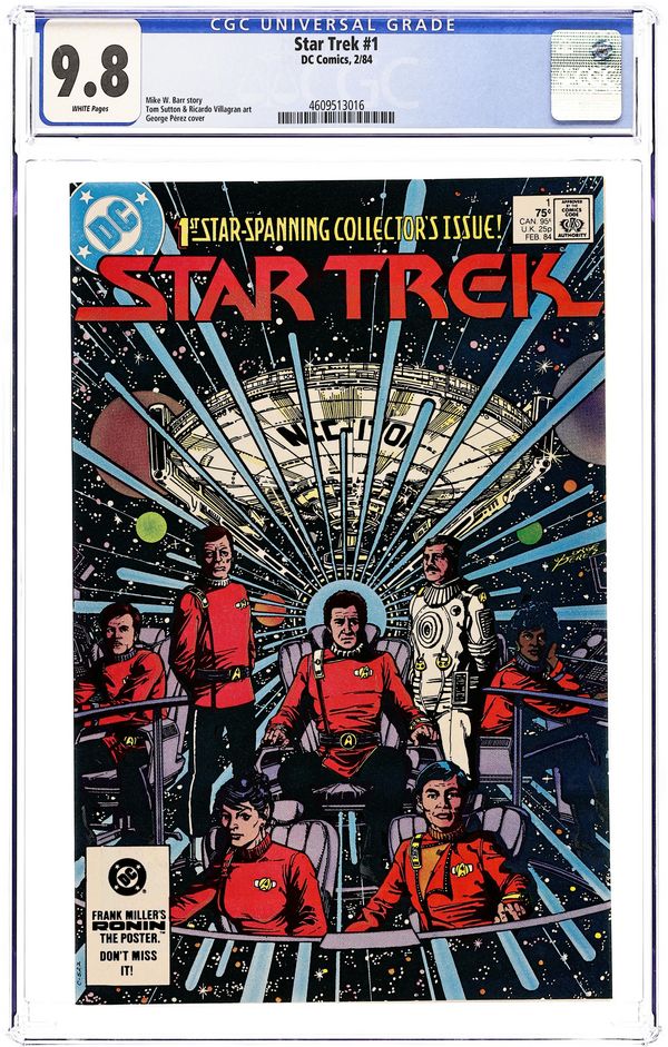 Direct Edition. Kirk, Bones, Scotty, Uhura, Sulu and Saavik lead the crew of the U.S.S. Enterprise in search of the Klingons in "The Wormhole Connection". Part 1 of 4, continued next issue. Script by Mike W. Barr, pencils by Tom Sutton, inks by Ricardo Villagran. Marv Wolfman edits. U.S.S. Gallant appears. In Trek continuity, series starts after the events of the film Star Trek II: The Wrath Of Khan. George Perez cover. Cover price $0.75.