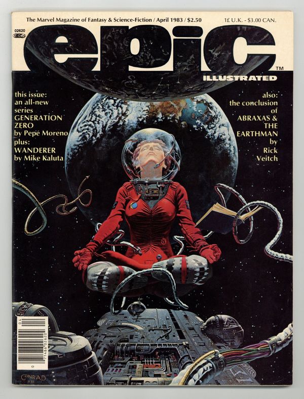 Cover art by Tim Conrad. The Chess Game featuring Generation Zero, script by Pepe Moreno (plot) and Archie Goodwin (script), art by Pepe Moreno. Phantom City featuring Generation Zero, script by Pepe Moreno (plot) and Archie Goodwin (script), art by Pepe Moreno. Mime, script and art by Will Brown. Man and Whale (Chapter Eight) starring Abraxas And The Earthman, script and art by Rick Veitch. Time Bomb starring Dr. Watchstop, script and art by Ken Macklin. Mediaview by Dennis O'Neil. Weird Adventures on Other Worlds: An Informal History of Planet Comics article by Ron Goulart. The Departure (Chapter Three)--Last Of The Dragons, script by Dennis O'Neil (script) and Carl Potts (plot), pencils by Carl Potts, inks by Terry Austin. Wanderer, script by Archie Goodwin, art by Michael Kaluta. Gameview by Steven Grant. Textpiece with art from Walter Simonson's Star Slammers. Godfather Death, script and art by Scott Hampton; The Brothers Grimm adaptation. 100 pgs. Oct, 1983. $2.50. Cover price $2.50.