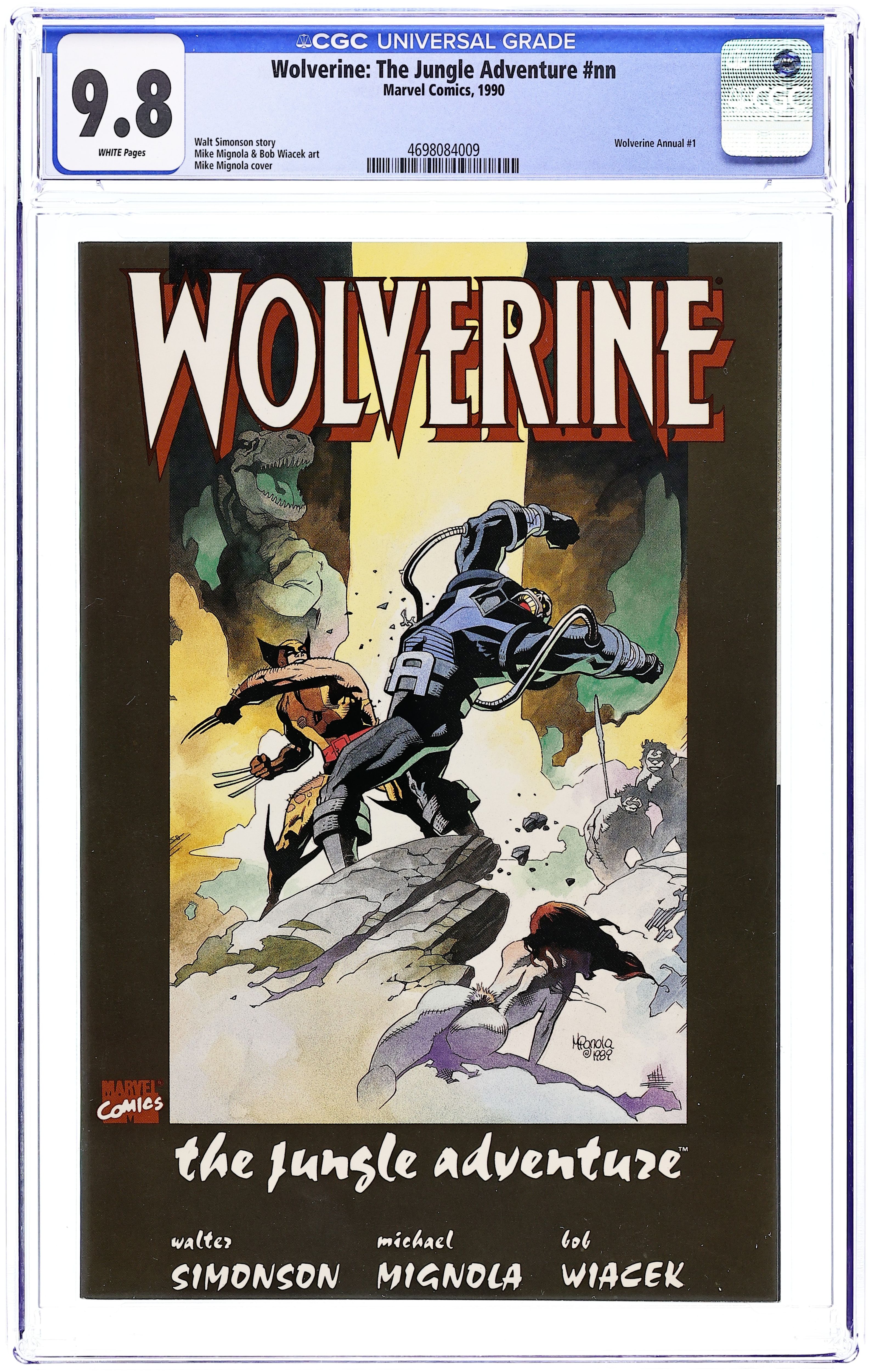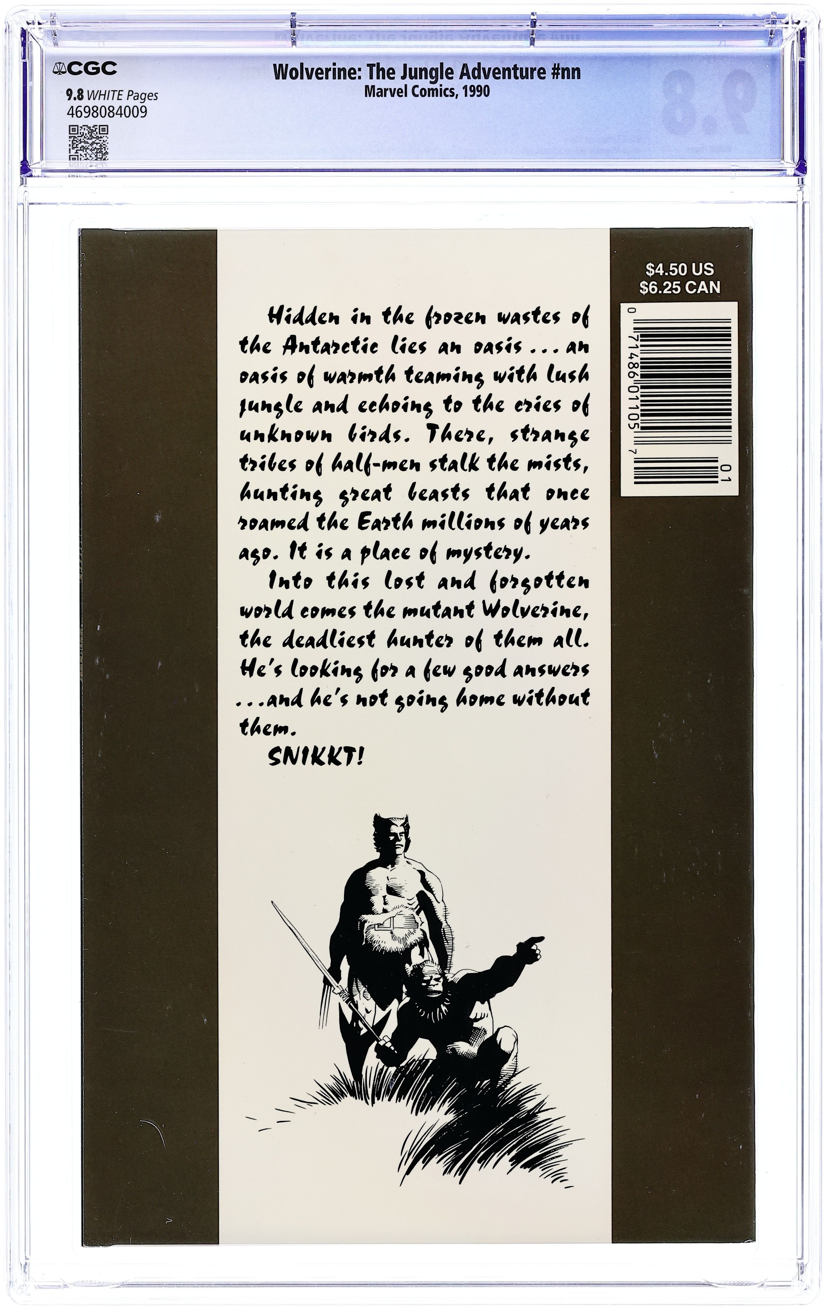 "The Jungle Adventure!" Story by Walt Simonson. Art by Mike Mignola and Bob Wiacek. The Canadian mutant Wolverine, of the Uncanny X-Men, ventures into the Savage Land, the land that time forgot, seeking answers. Among a tribe of natives, Logan finds a place hunting the great beasts that walked the earth millions of years ago, but all is not as it seems. Things turn ugly when Wolverine comes face-to-face with the five-thousand year old mutant tyrant known as Apocalypse. 48 pages. Square-bound softcover. Cover price $4.50.