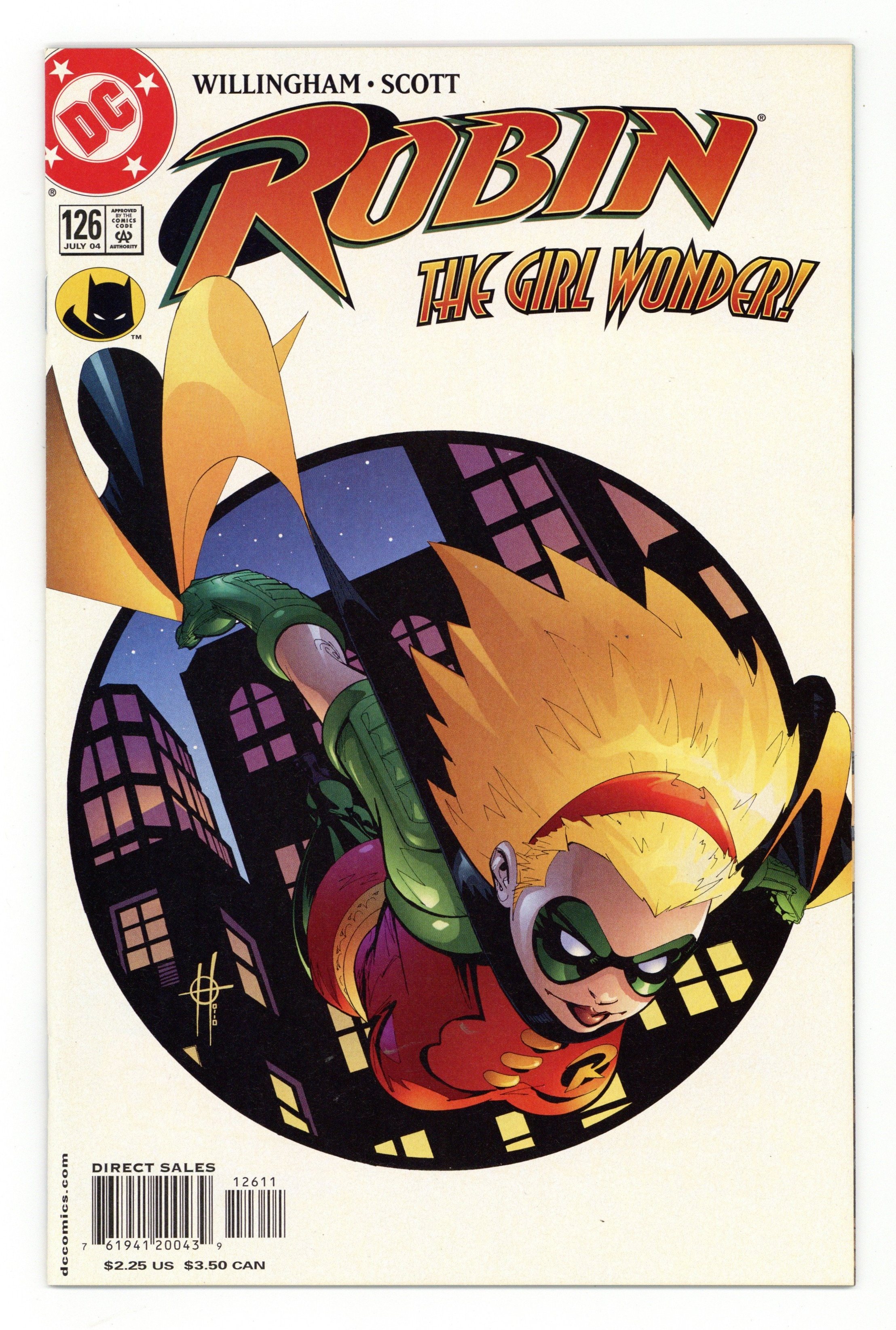 1st Full appearance of Stephanie Brown aka The Spoiler as Robin. Batman guests. Tim Drake has relinquished the cape and mask. Now, Batman must name a successor ? and his new Robin isn't a Boy Wonder at all... The Girl Wonder makes her startling debut in ROBIN #126, written by Bill Willingham (FABLES)! This landmark issue ? a perfect jumping-on point for new readers ? also features the debut of new series artist Damion Scott (BATGIRL)! In the wake of the startling events of ROBIN #125, in which Tim Drake gave up the mantle of Robin, Batman must find a new teen hero to fill the void as his faithful apprentice. But you won't get the full story here. You'll just have to pick up the issue to discover the identity of the first female to take on the role of Robin in official continuity! Batman's choice will have repercussions throughout the DC Universe...and this story gets the ball rolling for much bigger events coming later in 2004. Get in on the ground floor of history in the making with ROBIN #126! ROBIN is an ongoing series edited by Michael Wright. The 32-page issue #126 arrives in comic-book stores May 19 with a cover price of $2.25 U.S. Cover price $2.25.