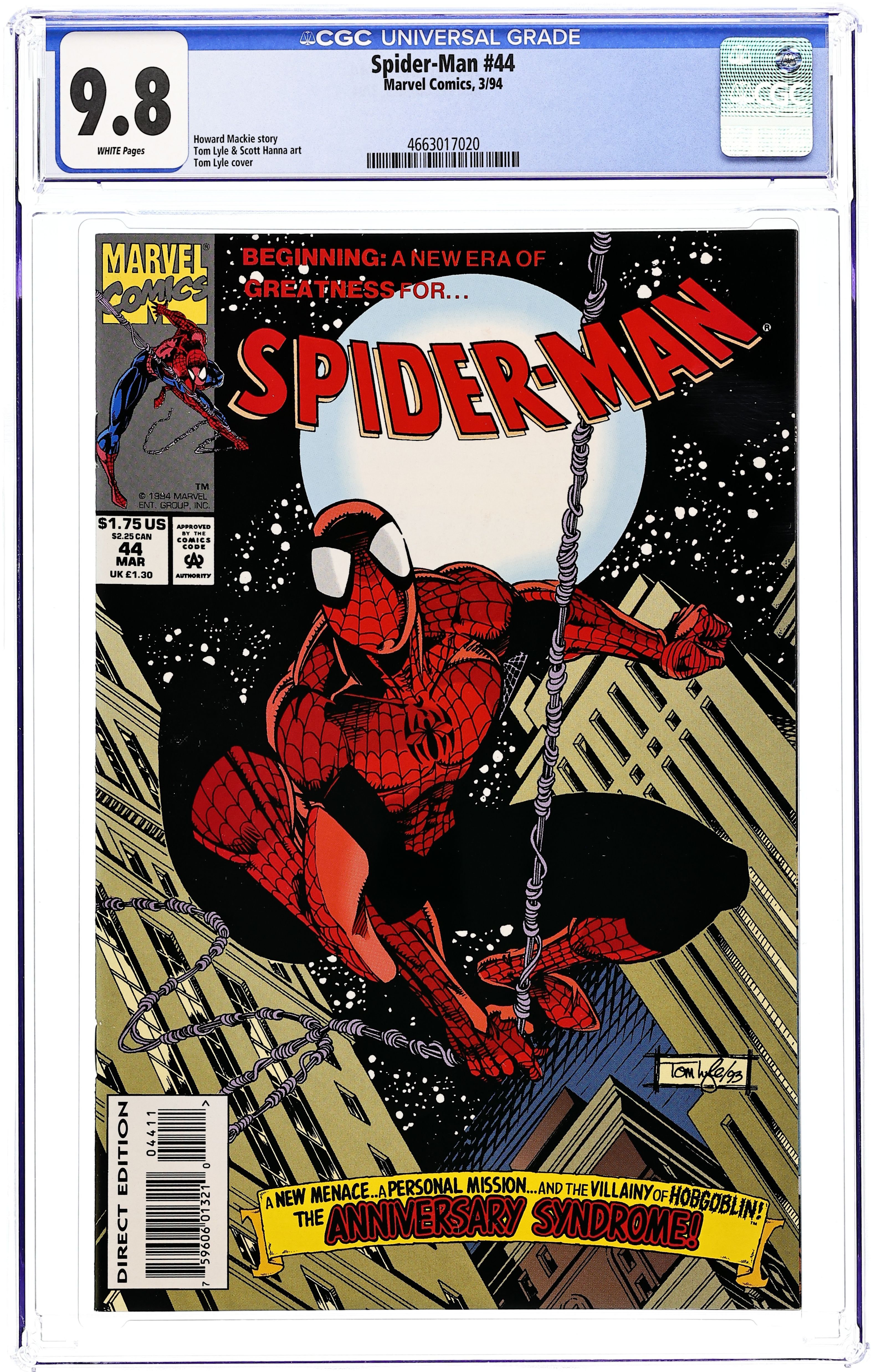 Direct Edition. "The Anniversary Syndrome" Script by Howard Mackie. Pencils by Tom Lyle. Inks by Scott Hanna. Cover by Tom Lyle. The wondrous wall-crawler goes on a Midnight mission across Manhattan -- to stop a major weapons sale. The spectacular one is not expecting to run into any super-villains during his nocturnal endeavor, but the arms dealer has one on retainer: the Hobgoblin! However Spider-Man is very focused and determined on this night, and he makes short work of the goblin! No one will escape from Spider-Man on the anniversary of Uncle Ben's death. Cameo appearance by Mary Jane Watson. (Note: Howard Mackie begins his four-and-a-half year run as the writer of the Spider-Man (1990) series.) 32 pages. Cover price $1.75.