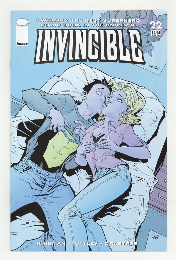 $48.00on sale 03.09 $2.95 monthly ongoing series full color 32 pages written by ROBERT KIRKMAN art by RYAN OTTLEY cover by RYAN OTTLEY & BILL CRABTREE CONCEPT: Mark Grayson is the son of the most powerful superhero on the planet. Recently he's begun to inherit his father's powers, and in doing so, he has learned that everything he's been told is a lie. His father wasn't sent here to protect the planet, he was sent here to enslave it. The only thing that prevented him from succeeding was his own son. But he's still out there, and nobody knows when he will strike again. THIS ISSUE: Mark and Amber's relationship is heating up now that they are in college and away from the prying eyes of parental supervision. Also in this issue, yet another person discovers Mark's secret identity. How does that Spider-Man guy do it? Oh, wait...never mind. Cover price $2.95.