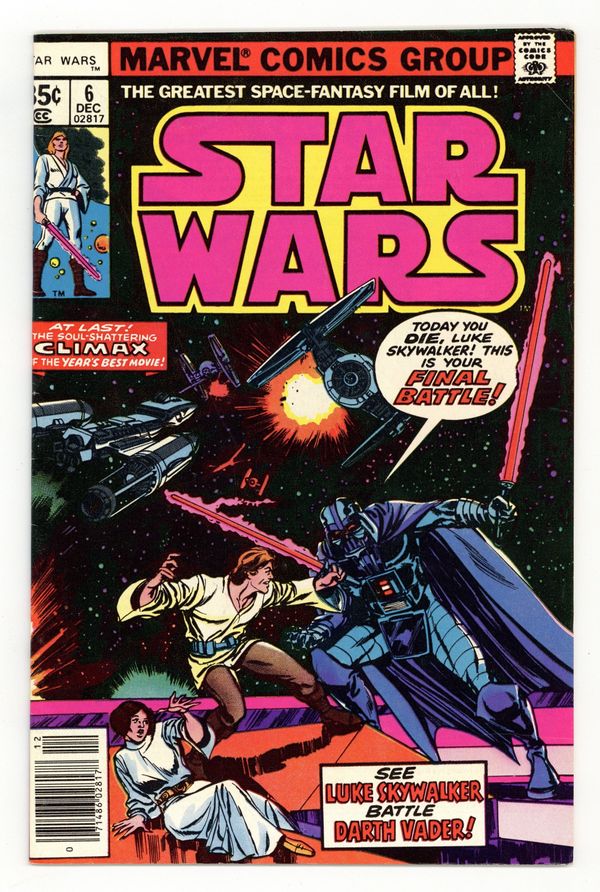 Ends Dec 8 9:27 PM CST Bid History 3 bids Current Bid $17 Your Secret Max Bid If you'd like to bid, please log in or register. 1st printing, standard 35 Cent Newsstand Edition with UPC. A New Hope: Part 6 of 6. "Is this the Final Chapter?!" Based on the screenplay by George Lucas. Adapted by Roy Thomas. Art by Howard Chaykin, Rick Hoberg, and Bill Wray. This is it, the explosive conclusion to the biggest space epic of all time! Armed with the secret plans, the Rebel Alliance mounts an all out attack on the evil Empire's ultimate weapon, the Death Star. However, they'll have to break through the monstrous space station's own defenses and dozens of deadly Tie-Fighters to get to its weak point. As the Rebels' time begins to run out, and their fleet of X-Wing Fighters begins to dwindle, it falls upon young Luke Skywalker and the power of the force to save the day. But first he'll have to get past the most dangerous man in the galaxy - Darth Vader! Cover price $0.35.