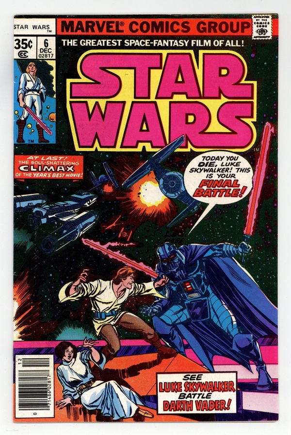 Ends Mar 2 9:23 PM CST Bid History 2 bids Current Bid $9 Your Secret Max Bid If you'd like to bid, please log in or register. 1st printing, standard 35 Cent Newsstand Edition with UPC. A New Hope: Part 6 of 6. "Is this the Final Chapter?!" Based on the screenplay by George Lucas. Adapted by Roy Thomas. Art by Howard Chaykin, Rick Hoberg, and Bill Wray. This is it, the explosive conclusion to the biggest space epic of all time! Armed with the secret plans, the Rebel Alliance mounts an all out attack on the evil Empire's ultimate weapon, the Death Star. However, they'll have to break through the monstrous space station's own defenses and dozens of deadly Tie-Fighters to get to its weak point. As the Rebels' time begins to run out, and their fleet of X-Wing Fighters begins to dwindle, it falls upon young Luke Skywalker and the power of the force to save the day. But first he'll have to get past the most dangerous man in the galaxy - Darth Vader! Cover price $0.35.