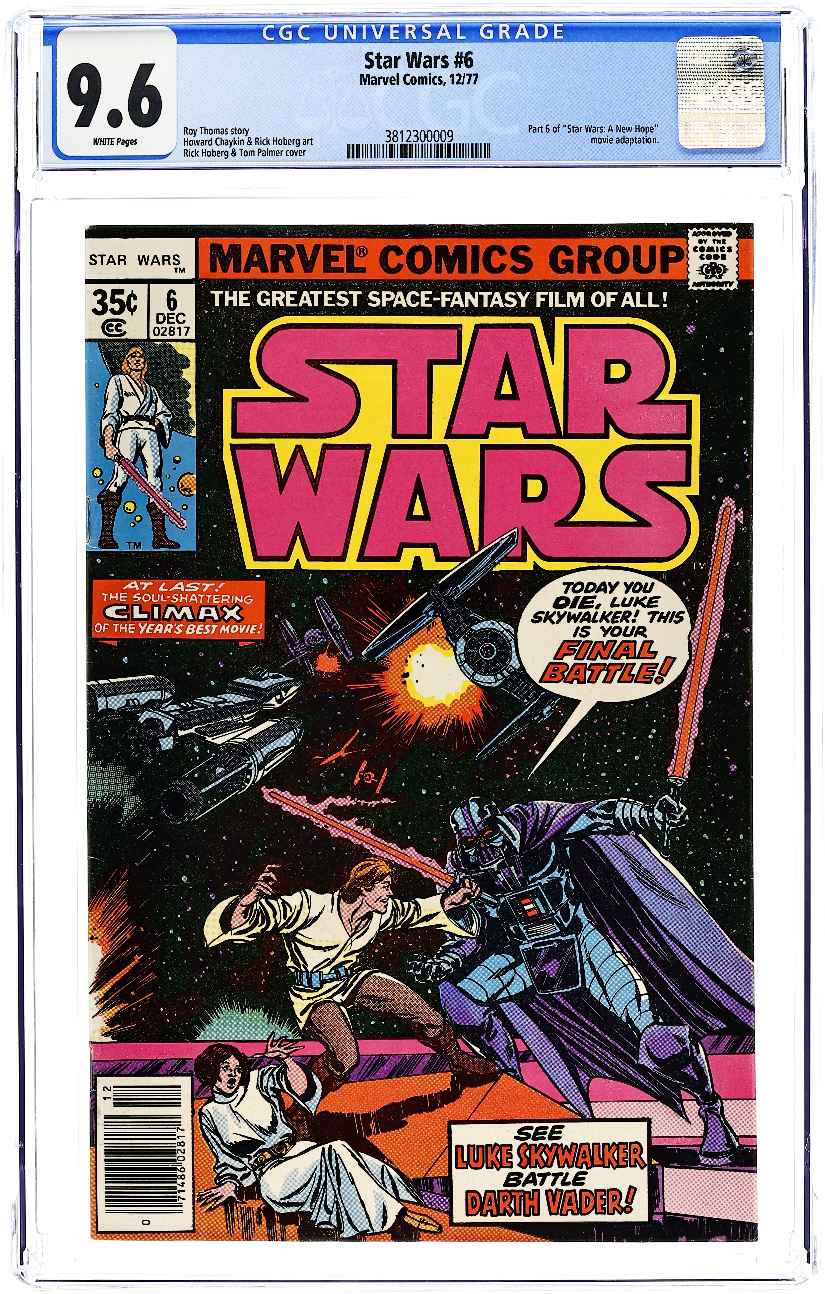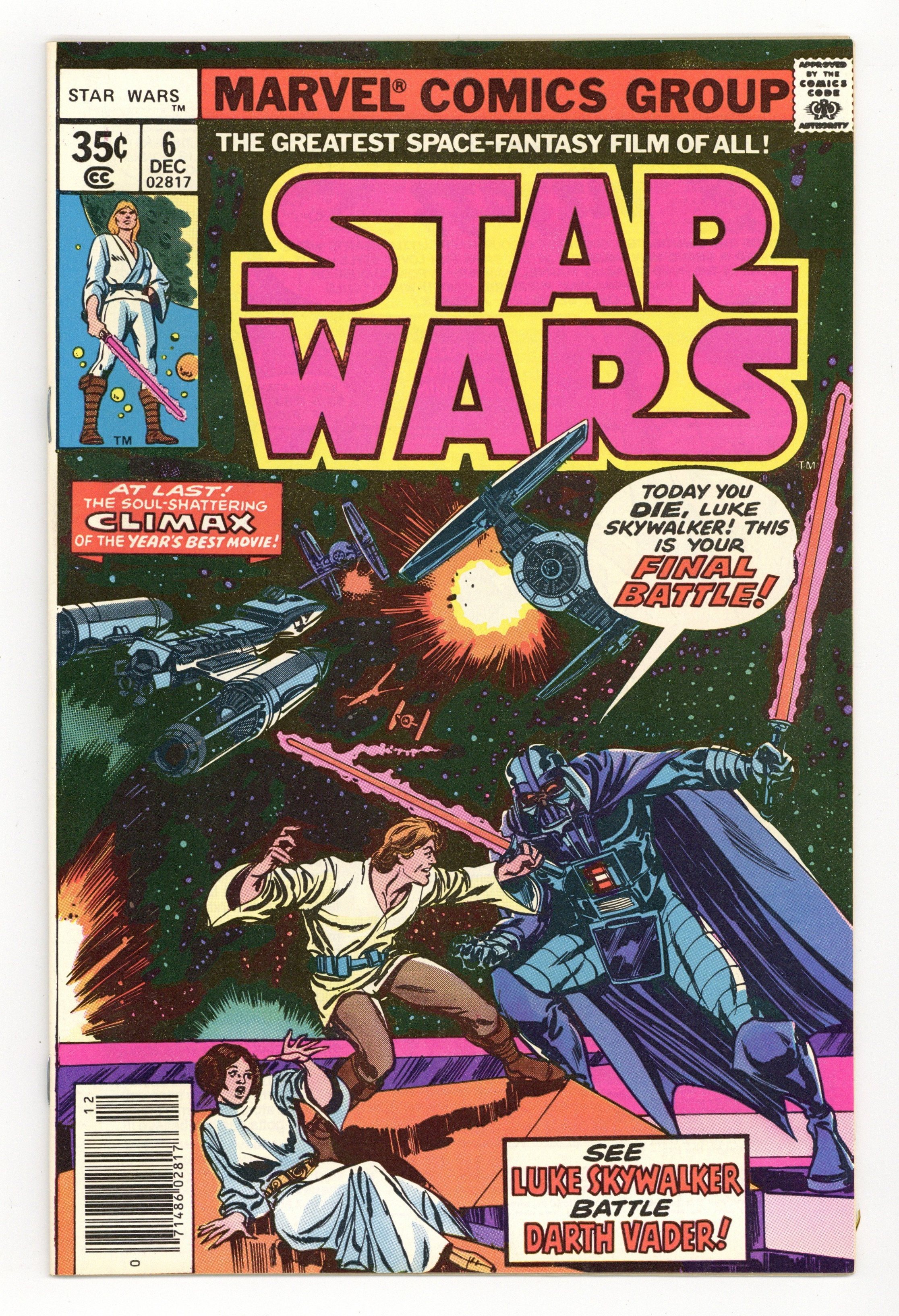 1st printing, standard 35 Cent Newsstand Edition with UPC. A New Hope: Part 6 of 6. "Is this the Final Chapter?!" Based on the screenplay by George Lucas. Adapted by Roy Thomas. Art by Howard Chaykin, Rick Hoberg, and Bill Wray. This is it, the explosive conclusion to the biggest space epic of all time! Armed with the secret plans, the Rebel Alliance mounts an all out attack on the evil Empire's ultimate weapon, the Death Star. However, they'll have to break through the monstrous space station's own defenses and dozens of deadly Tie-Fighters to get to its weak point. As the Rebels' time begins to run out, and their fleet of X-Wing Fighters begins to dwindle, it falls upon young Luke Skywalker and the power of the force to save the day. But first he'll have to get past the most dangerous man in the galaxy - Darth Vader! Cover price $0.35.