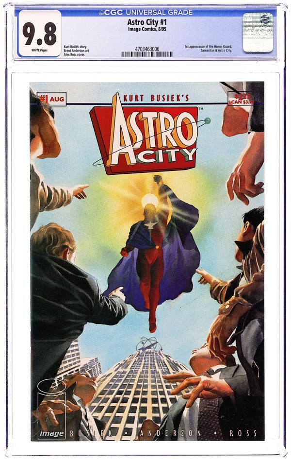 There's very little rest in a day for Samaritan, who must juggle a secret identity, a day job and his duties as a hero in "In Dreams." Appearances by Quarrel, Cleopatra, Black Rapier, N-Forcer, M.P.H., Beautie, Living Nightmare. Script by Kurt Busiek, art by Brent Anderson. Cover by Alex Ross. Centerspread of Ross' cover art. Back cover features Samaritan 'character gallery' by Ross. Cover price $2.25.