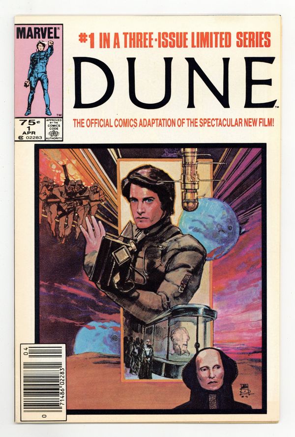 Direct Edition. Reprinted from Marvel Comics Super Special 36. Comic adaptation of the 1984 David Lynch movie starring Kyle MacLachlan. In this issue, it's the year 10,191 and the most precious substance is the spice which is vital for almost everything and exists on only one planet in the universe: a desolate and dry world of deserts, the planet Arrakis, also known as Dune. And on the planet, Paul Atreides is undergoing training and tests as he learns about the planet and the people. Script by Ralph Maccho and art by Bill Sienkiewicz. Cover price $0.75.