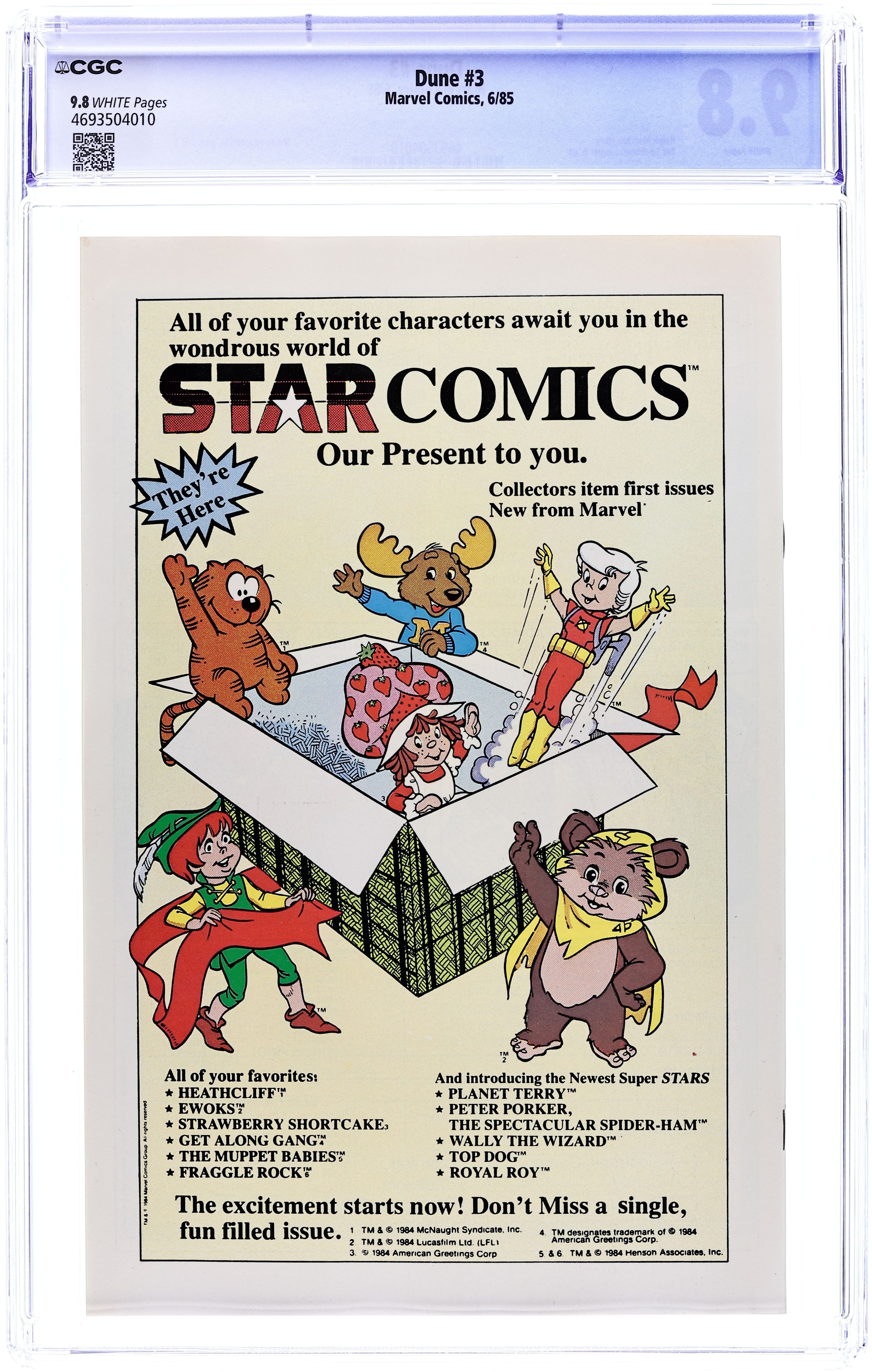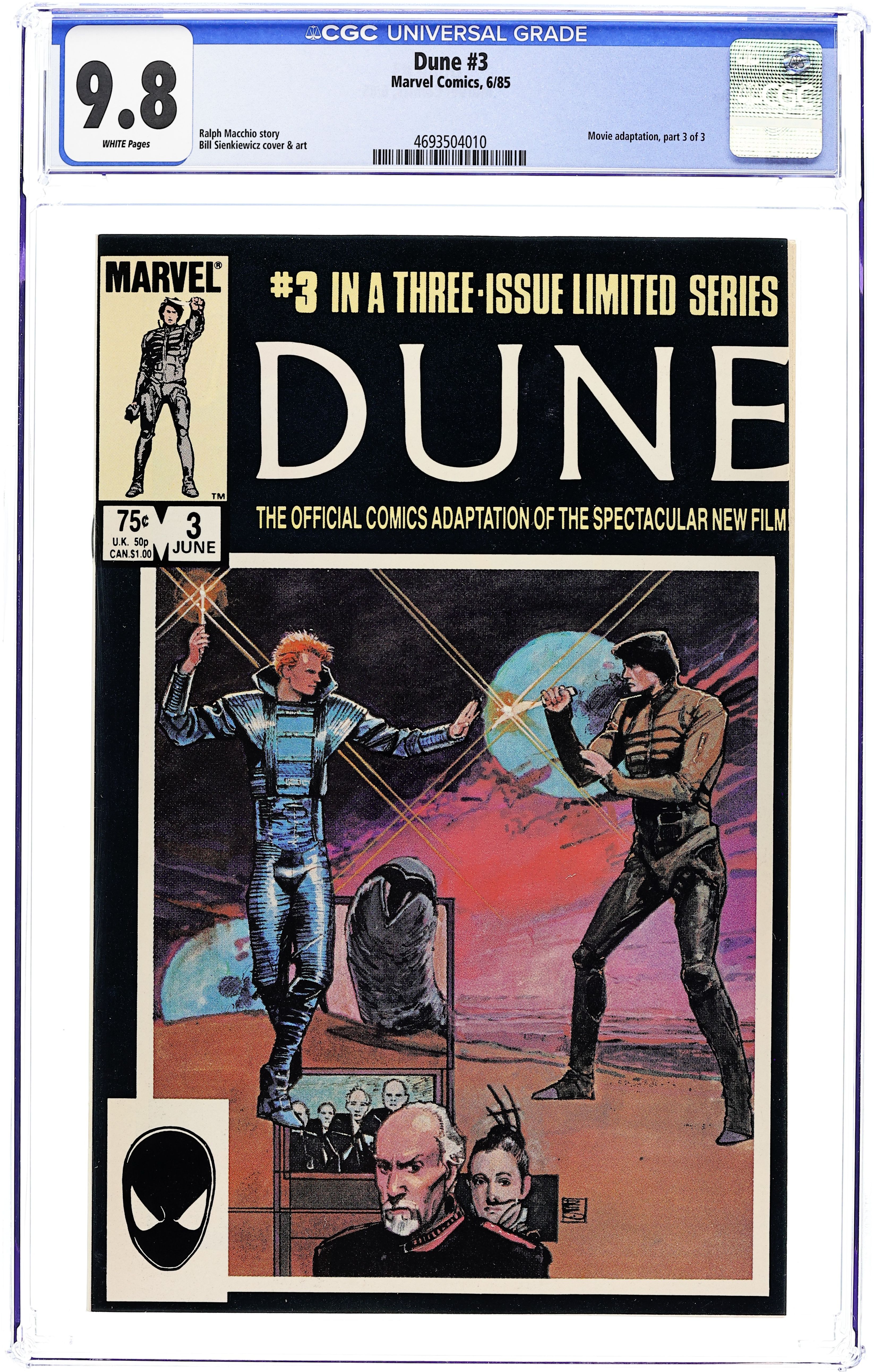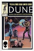 Reprinted from Marvel Comics Super Special 36. Comic adaptation of the 1984 David Lynch movie starring Kyle MacLachlan. In this issue, it is revealed that Paul may be the savior foretold in the prophecy as he recruits the nomadic natives of Dune to help him gain control of the world from House Harkonnen. And in so doing, Paul discovers that he is a sand rider which will aid him in his fight. Script by Ralph Maccho and art by Bill Sienkiewicz. Cover price $0.75.